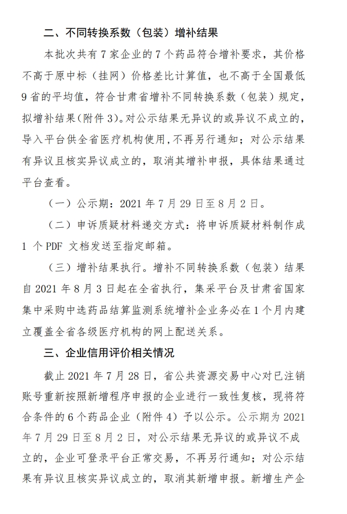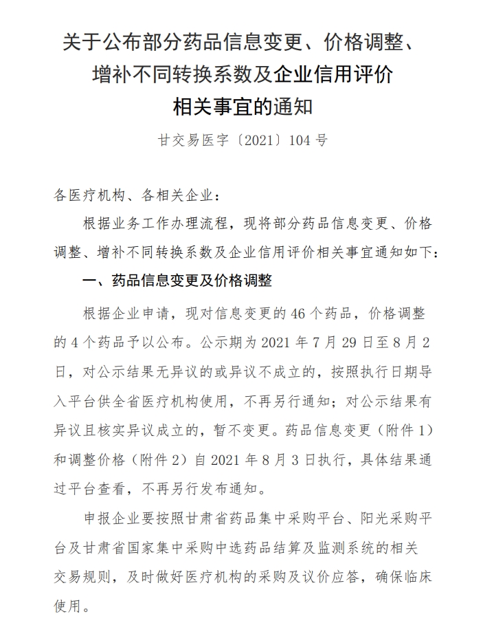【甘肃】甘肃省关于公布部分药品信息变更、价格调整、 增补不同转换系数及企业信用评价相关事宜的通知