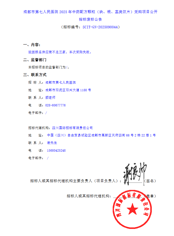 【成都市第七人民医院】四川省成都市第七人民医院2025年中药配方颗粒(块、根、茎类饮片)采购项目公开招标废标公告