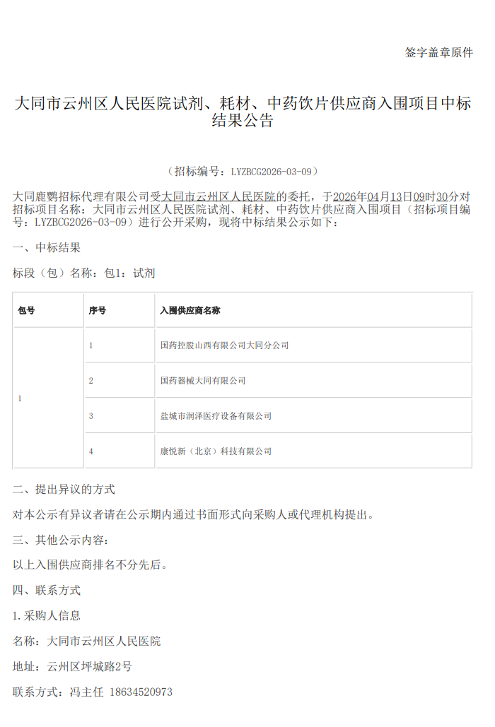 【大同市云州区人民医院】山西省大同市云州区人民医院试剂、耗材、中药饮片供应商入围项目中标结果公告