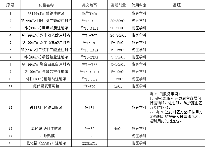 1.各放射性药品不同种类的不同价格,按种类常规剂量分别报价。