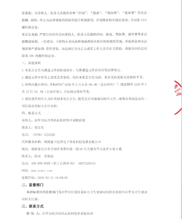【岳阳市汨罗市人民医院】湖南省汨罗市公立医疗机构药品、医用耗材及试剂集中配送服务项目更正公告
