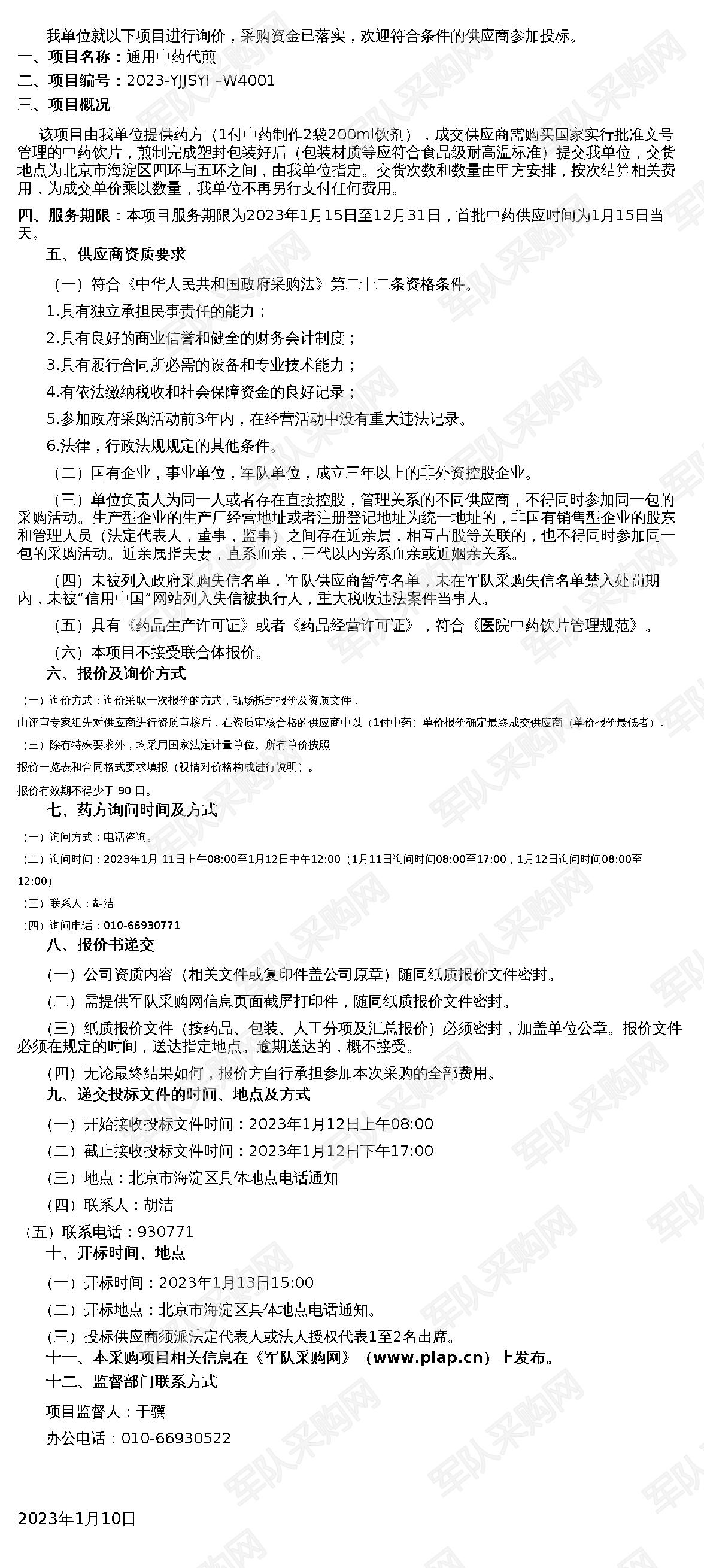 【军队采购】军队采购网通用中药代煎询价公告(2023-YJJSYI-W4001)