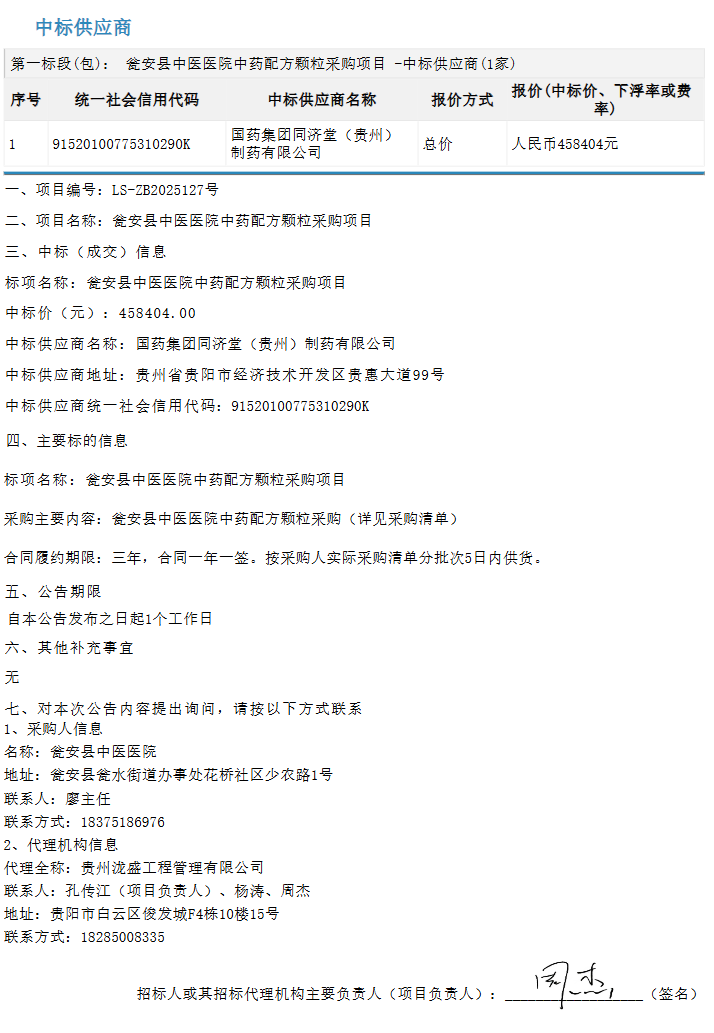 【黔南布依族苗族自治州瓮安县中医医院】贵州省瓮安县中医医院中药配方颗粒采购项目中标(成交)结果公告