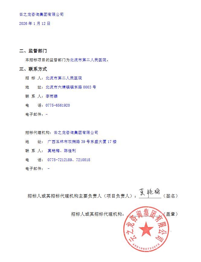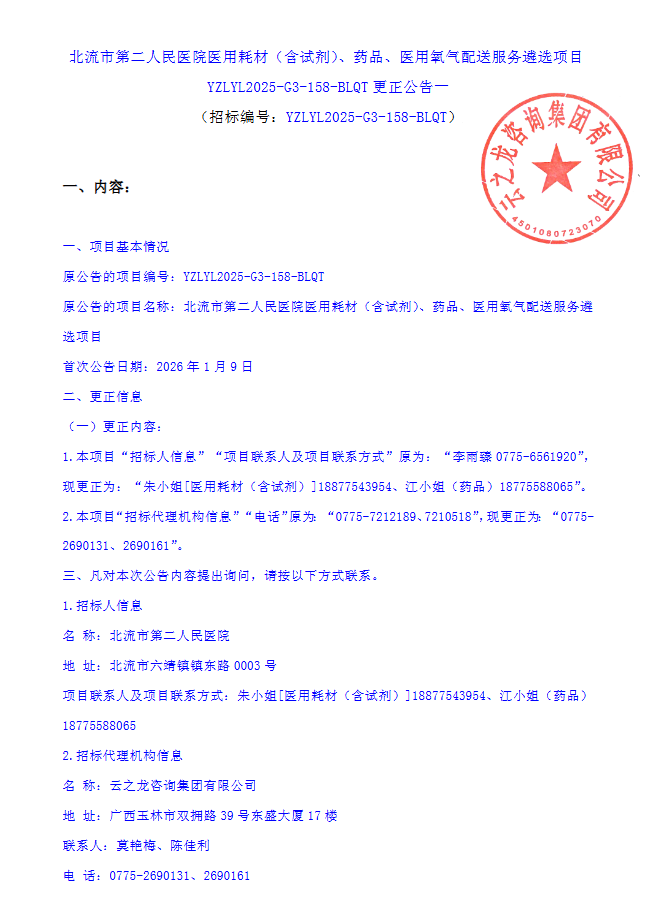 【北流市第二人民医院】广西壮族自治区玉林市北流市第二人民医院医用耗材(含试剂)、药品、医用氧气配送服务遴选项目YZLYL2025-G3-158-BLQT更正公告一