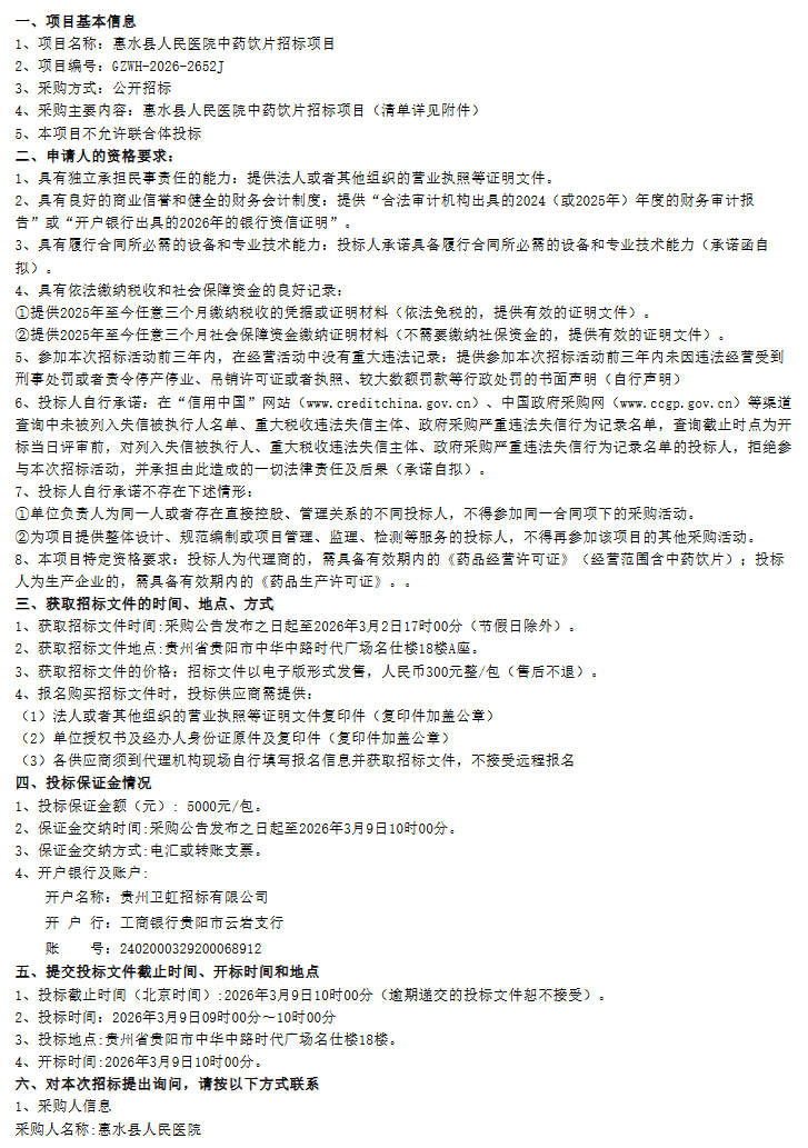 【黔南布依族苗族自治州惠水县人民医院】贵州省惠水县人民医院中药饮片招标项目采购公告