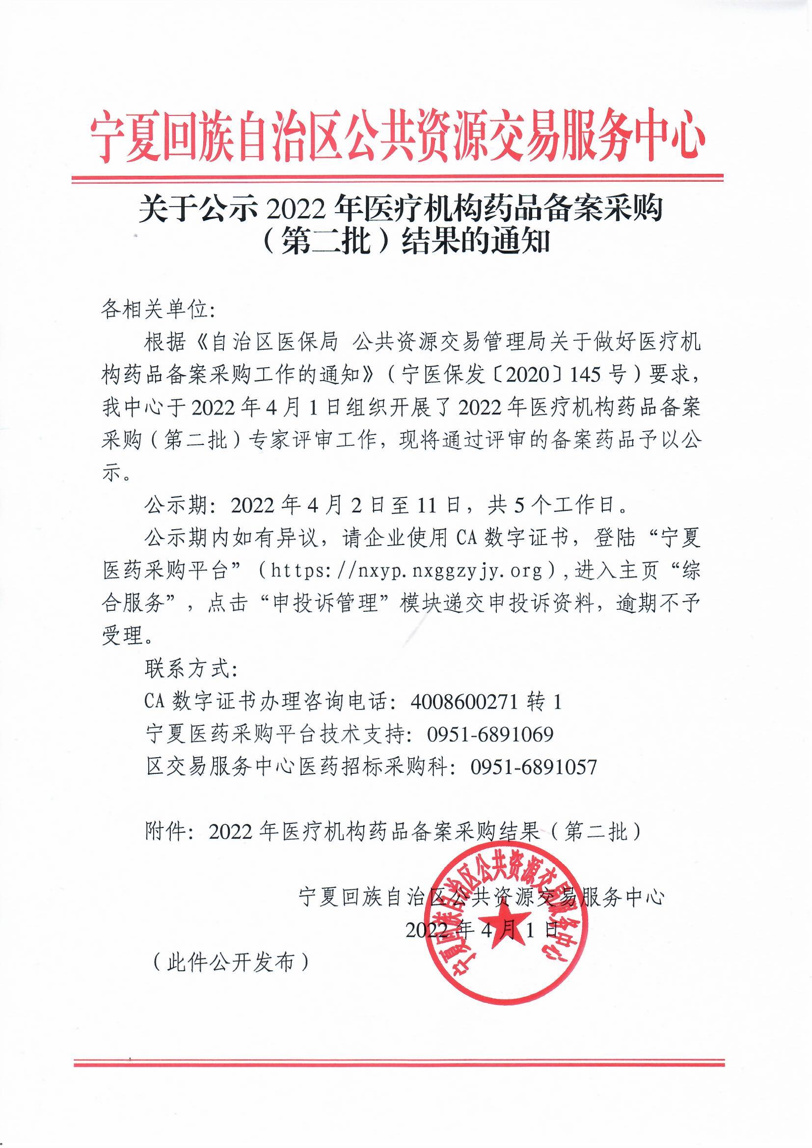 【宁夏】关于公示2022年医疗机构药品备案采购(第二批)结果的通知