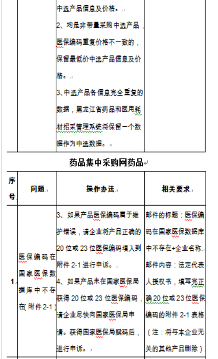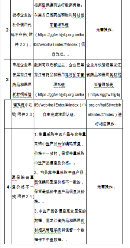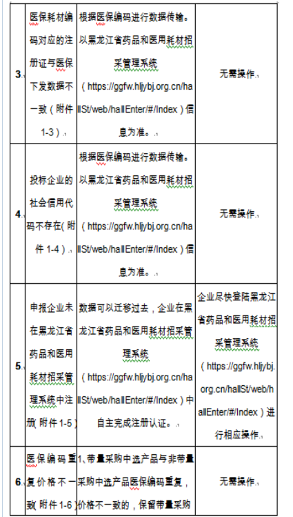 黑龙江省药品集中采购网中选产品中,部分企业中选产品数据信息存在以下问题,请按相关问题的相应要求操作,做好各项工作,未按时操作或未按相关要求操作的企业,影响签订合同、下订单、配送等后果由企业自行承担,并按照《医药企业价格和营销行为信用承诺书》进行信用评级调整。