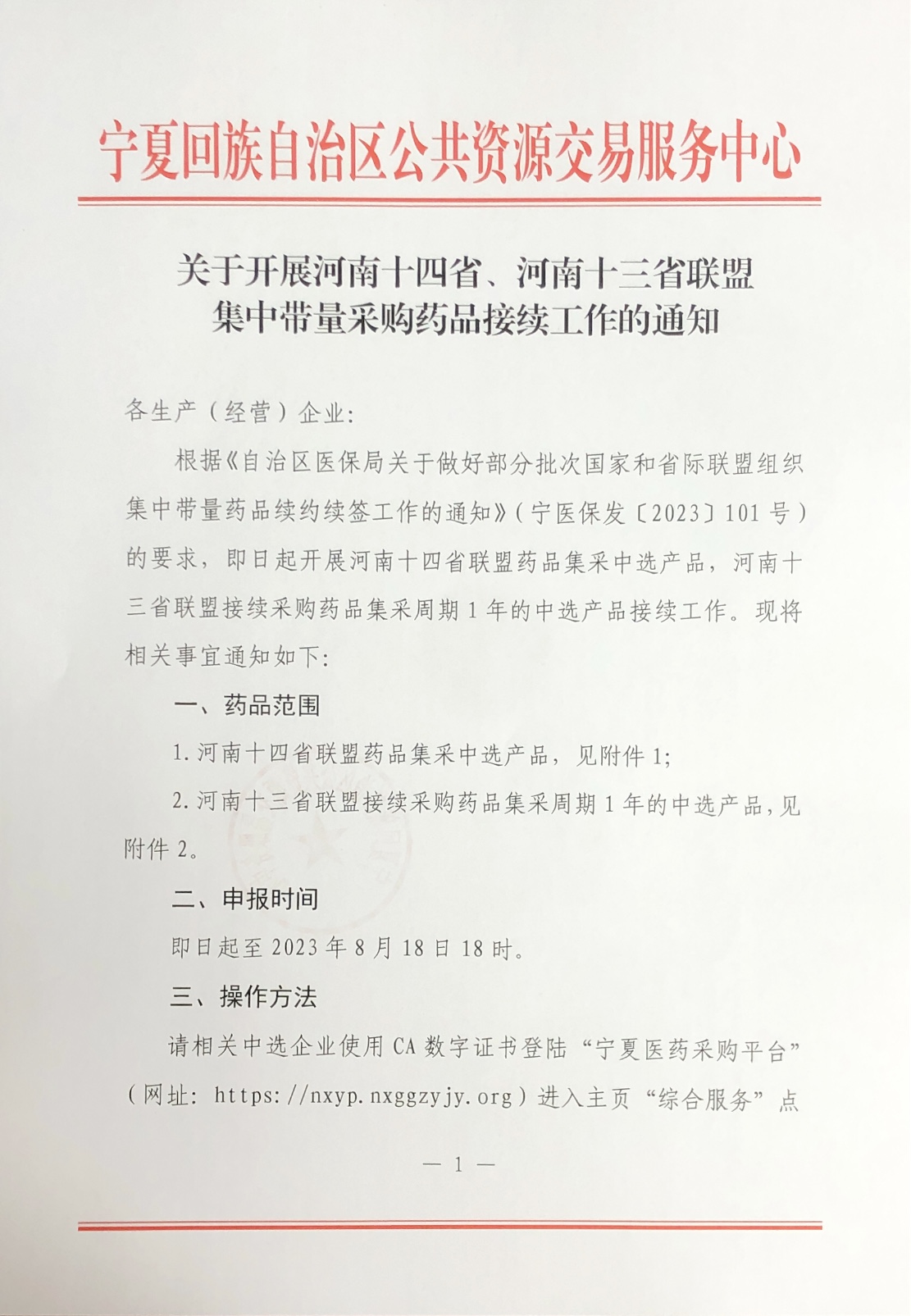 根据《自治区医保局关于做好部分批次国家和省际联盟组织集中带量药品续约续签工作的通知》(宁医保发〔2023〕101号)的要求,即日起开展河南十四省联盟药品集采中选产品,河南十三省联盟接续采购药品集采周期1年的中选产品接续工作。现将相关事宜通知如下: