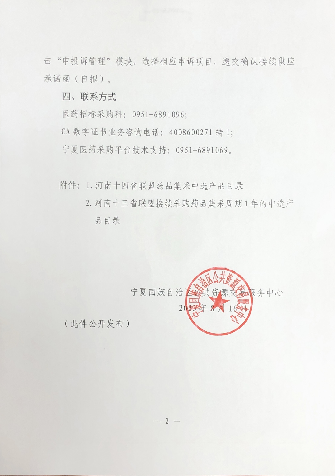 2.河南十三省联盟接续采购药品集采周期1年的中选产品,见附件2。