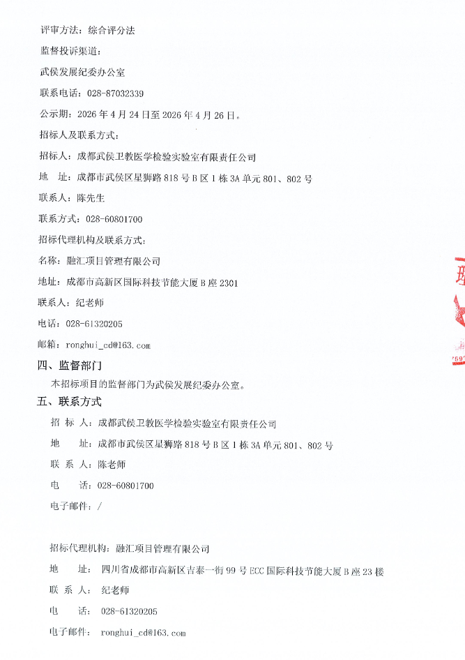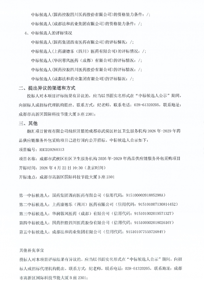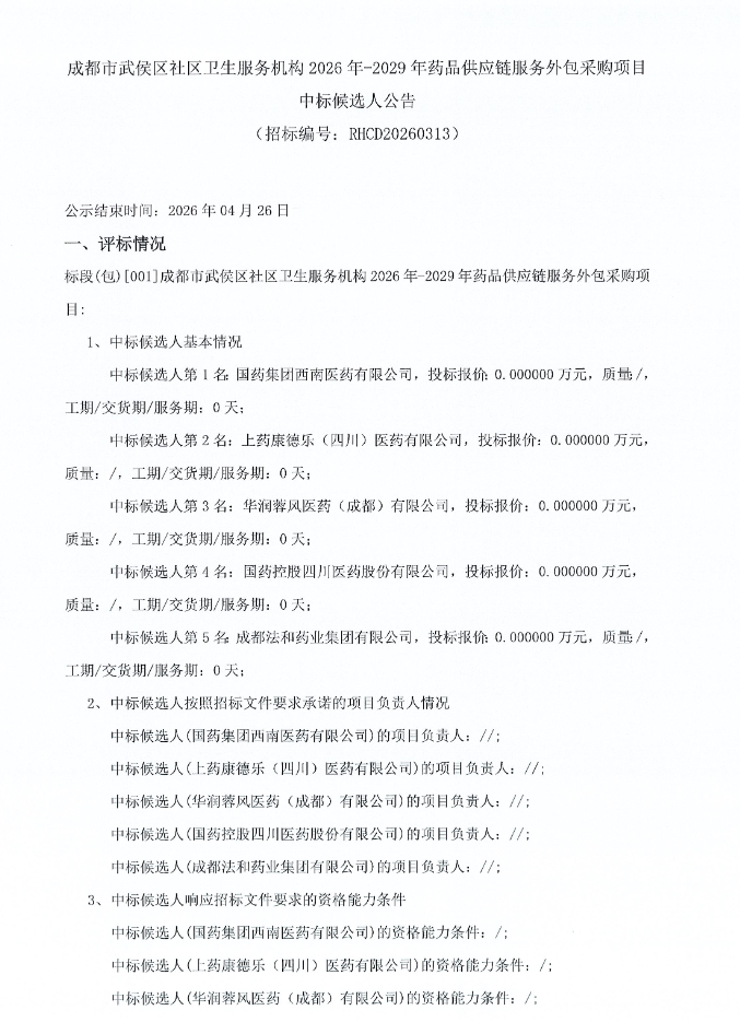 【成都市武侯区社区卫生服务机构】四川省成都市武侯区社区卫生服务机构2026年-2029年药品供应链服务外包采购项目中标候选人公告