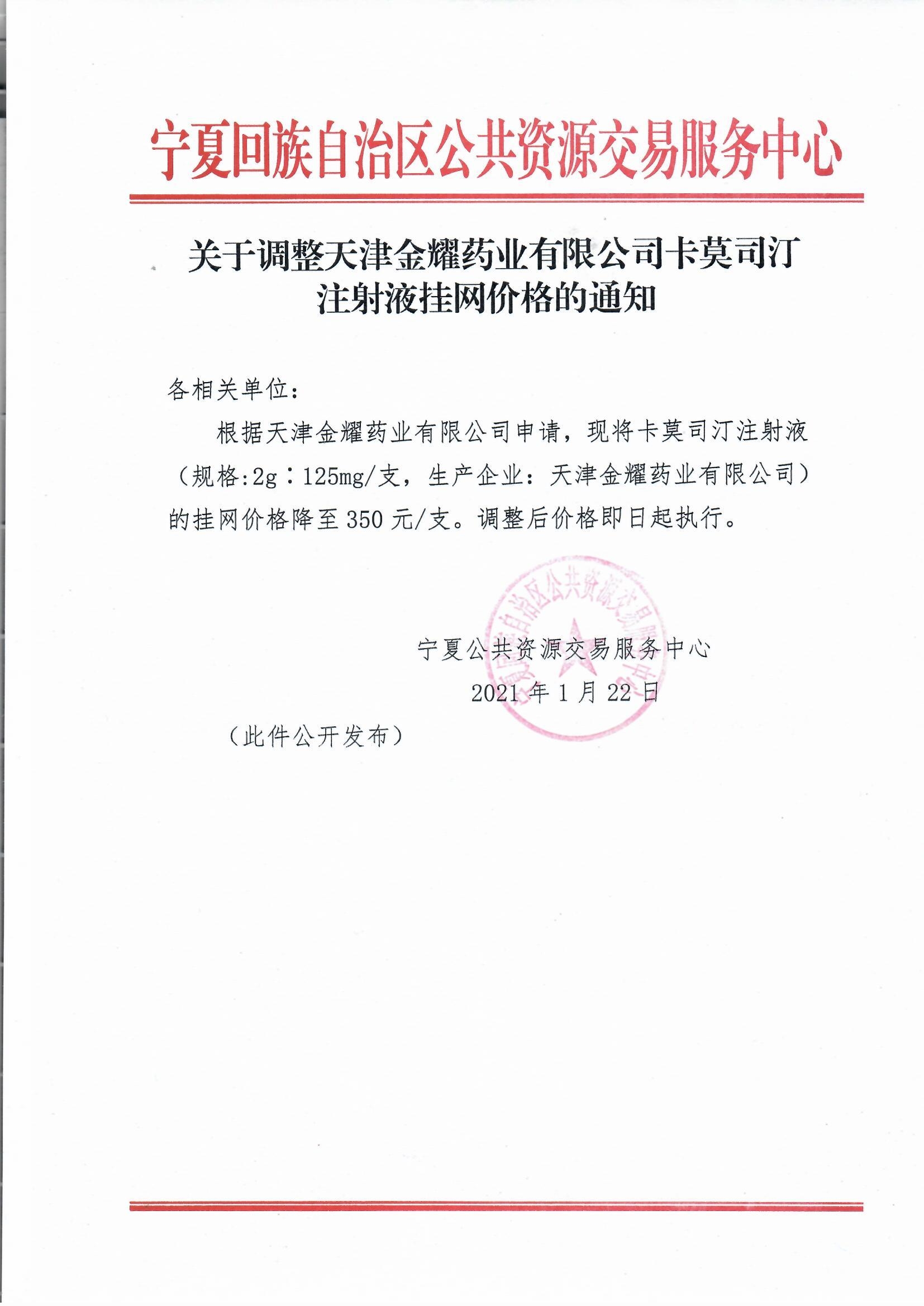 【宁夏】2021年宁夏自治区关于调整天津金耀药业有限公司卡莫司汀注射液挂网价格的通知