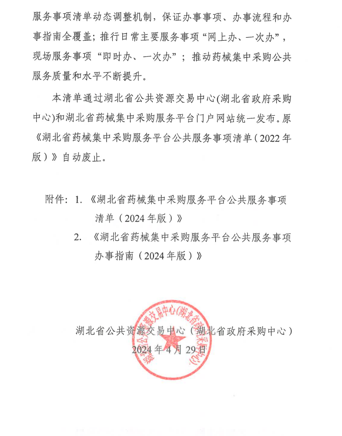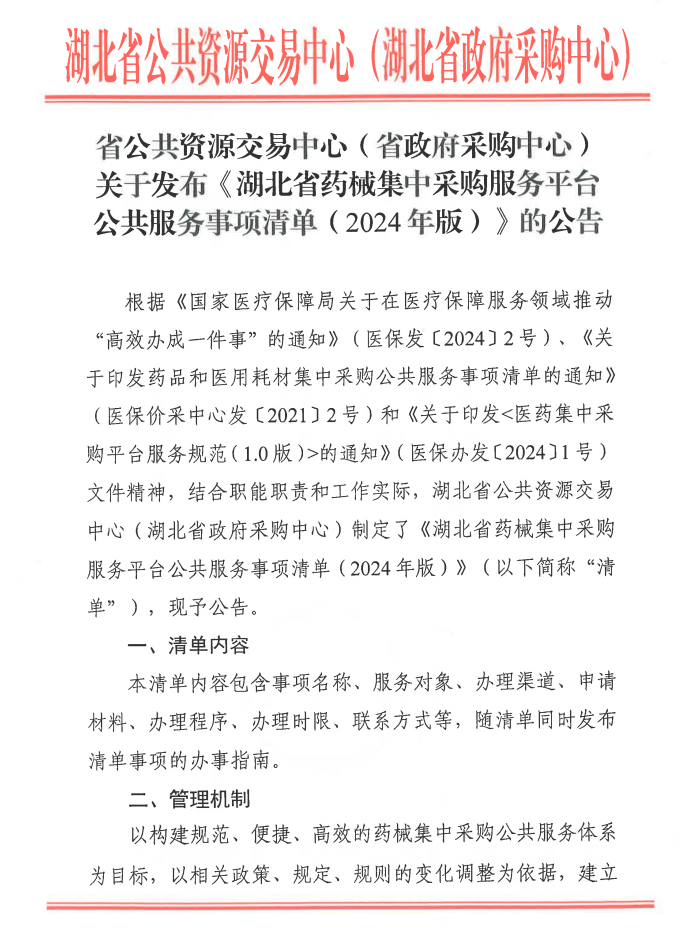 【湖北】关于发布《湖北省药械集中采购服务平台公共服务事项清单(2024年版)》的公告