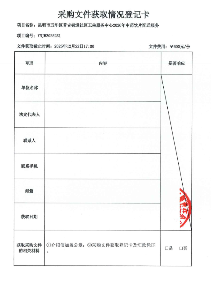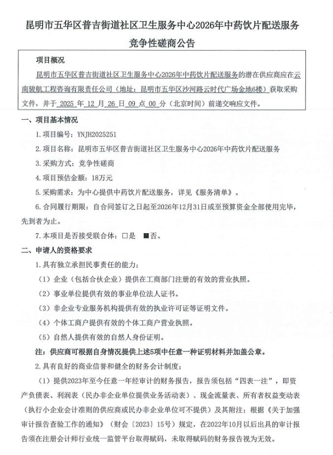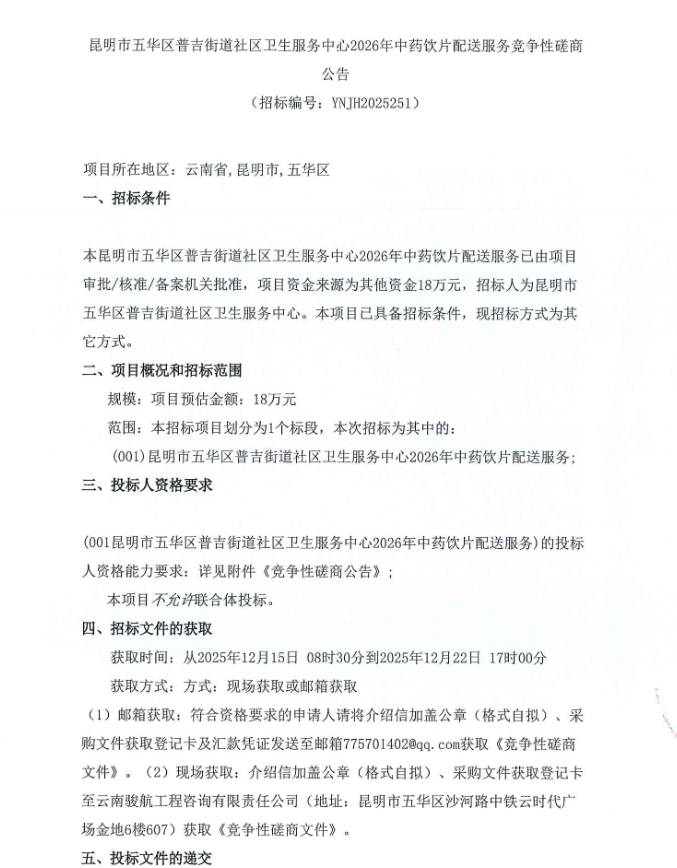 【昆明市五华区普吉街道社区卫生服务中心】云南省昆明市五华区普吉街道社区卫生服务中心2026年中药饮片配送服务竞争性磋商公告