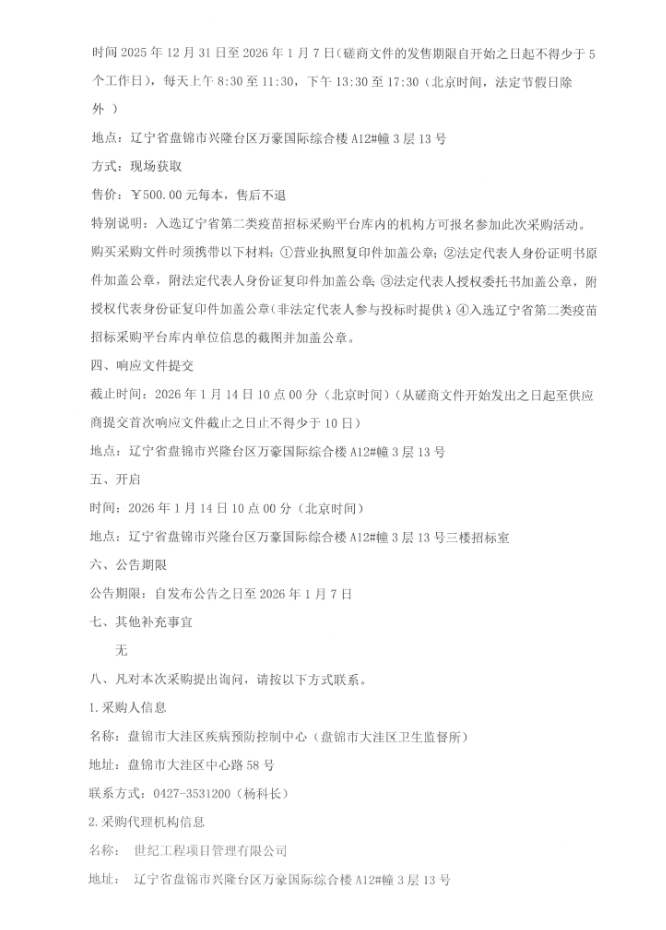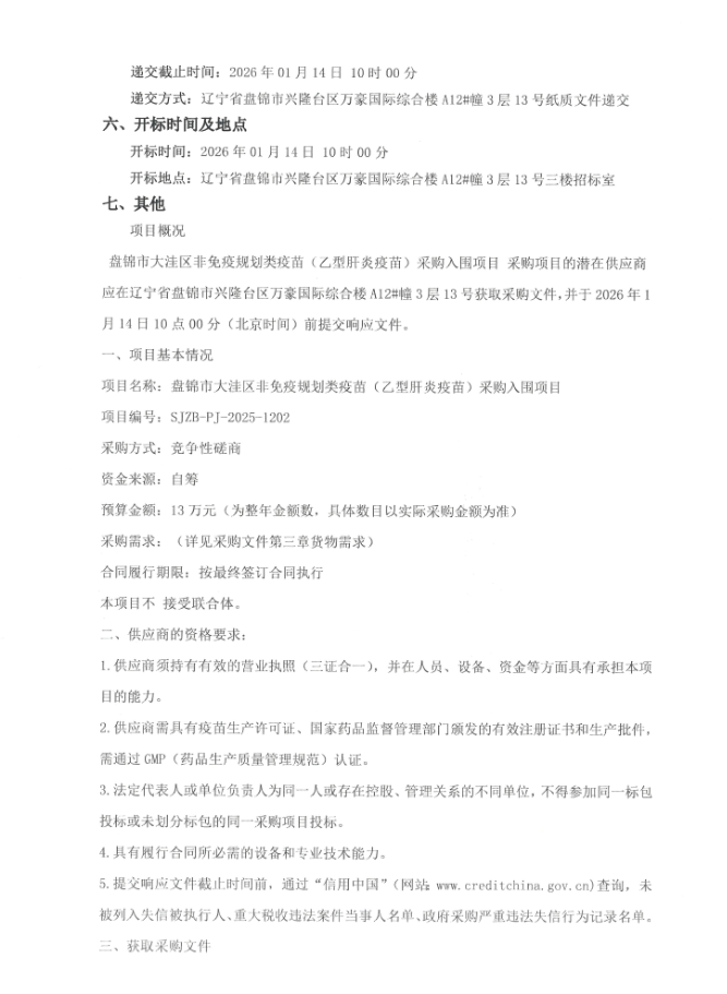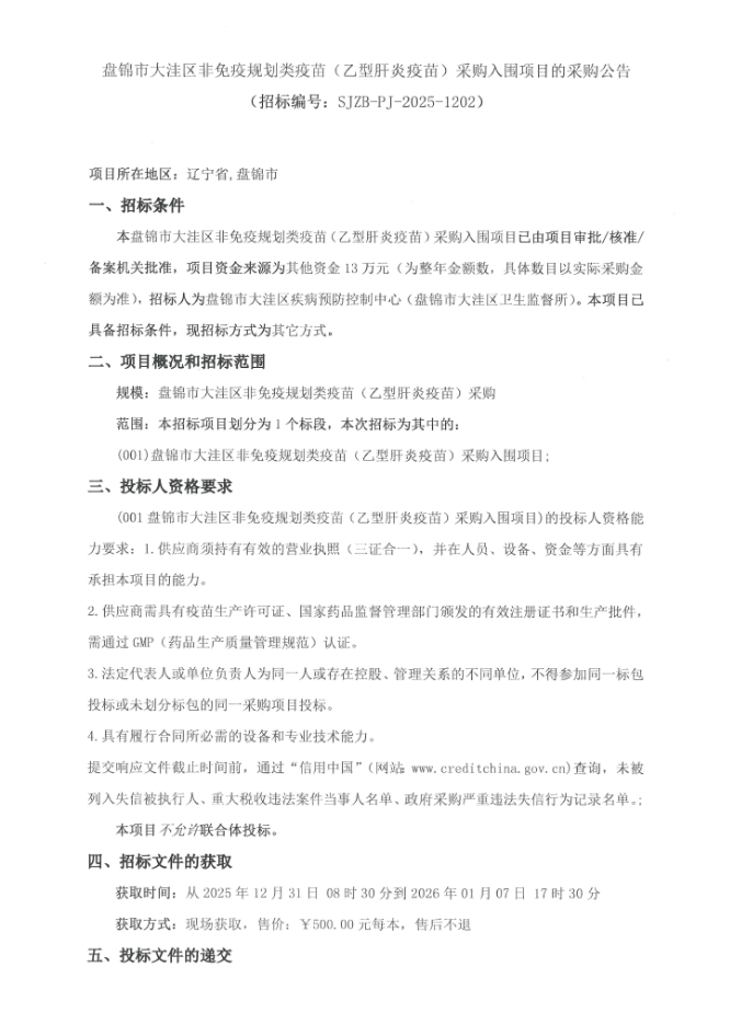 【盘锦市大洼区疾病预防控制中心】辽宁省盘锦市大洼区非免疫规划类疫苗(乙型肝炎疫苗)采购入围项目的采购公告
