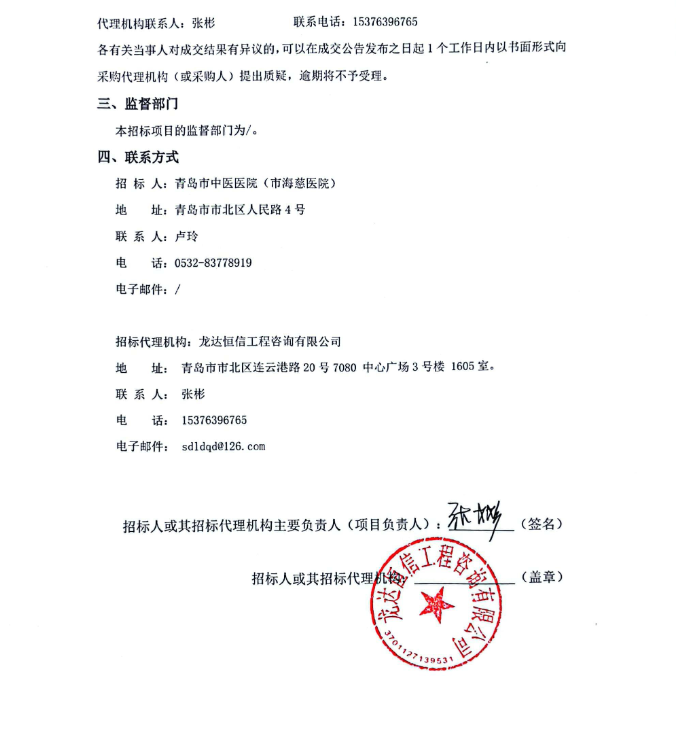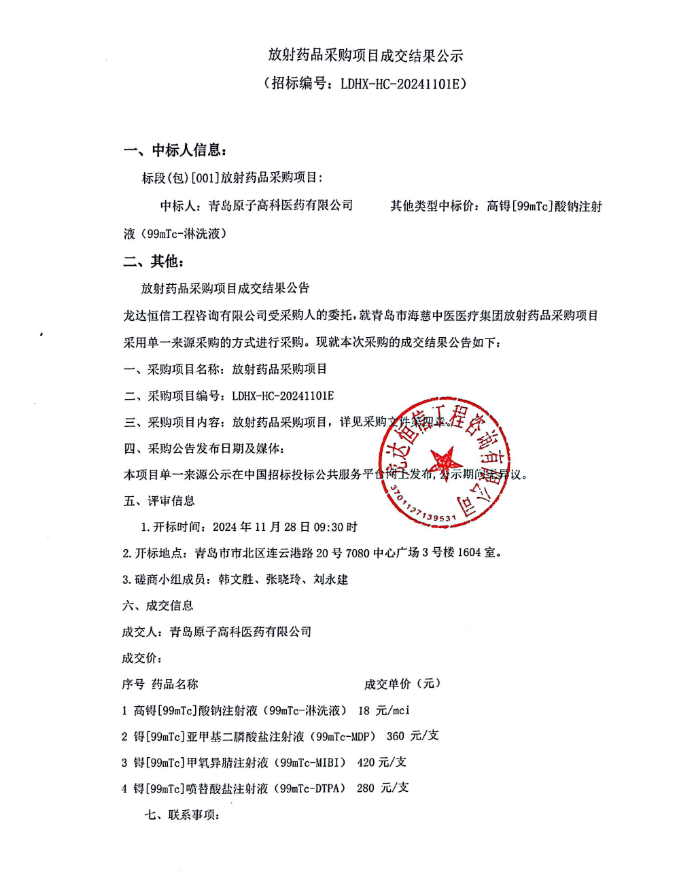 【青岛市中医医院】山东省青岛市中医医院放射药品采购项目成交结果公示