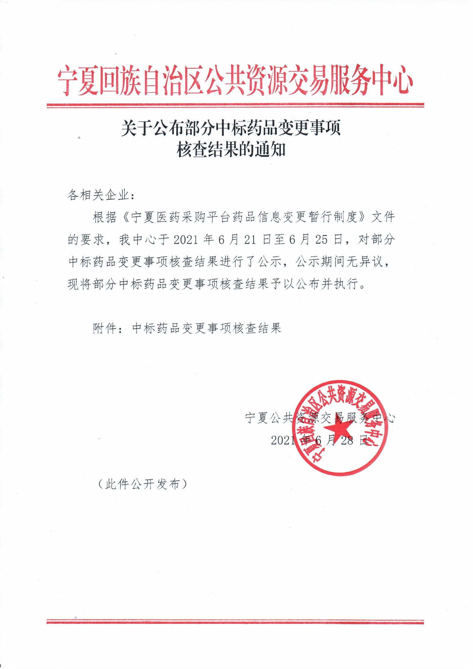【宁夏】2021年宁夏自治区关于公布部分中标药品变更事项核查结果的通知