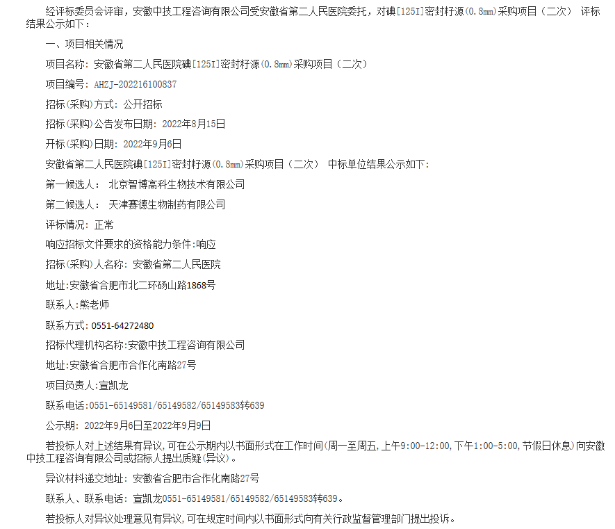 【安徽省第二人民医院】碘〔125I〕密封籽源(0.8mm)采购项目(二次)中标候选人公示