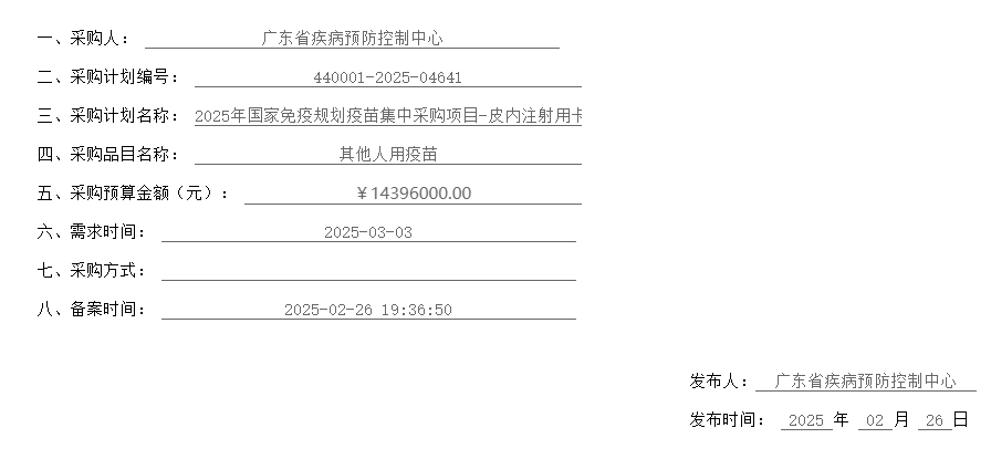 【广东省疾病预防控制中心】广东省2025年国家免疫规划疫苗集中采购项目-皮内注射用卡介苗
