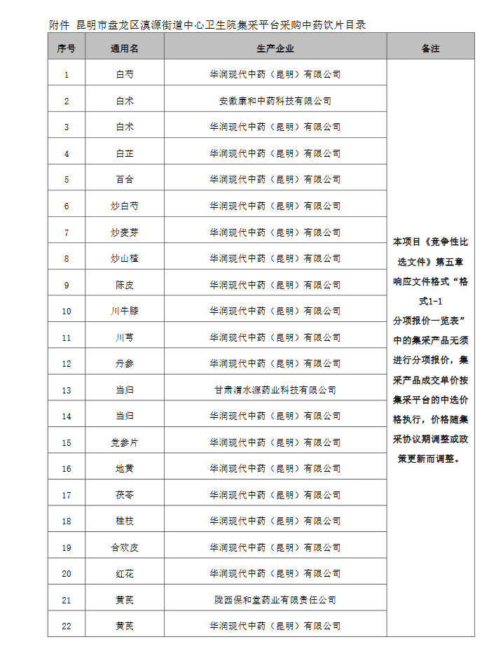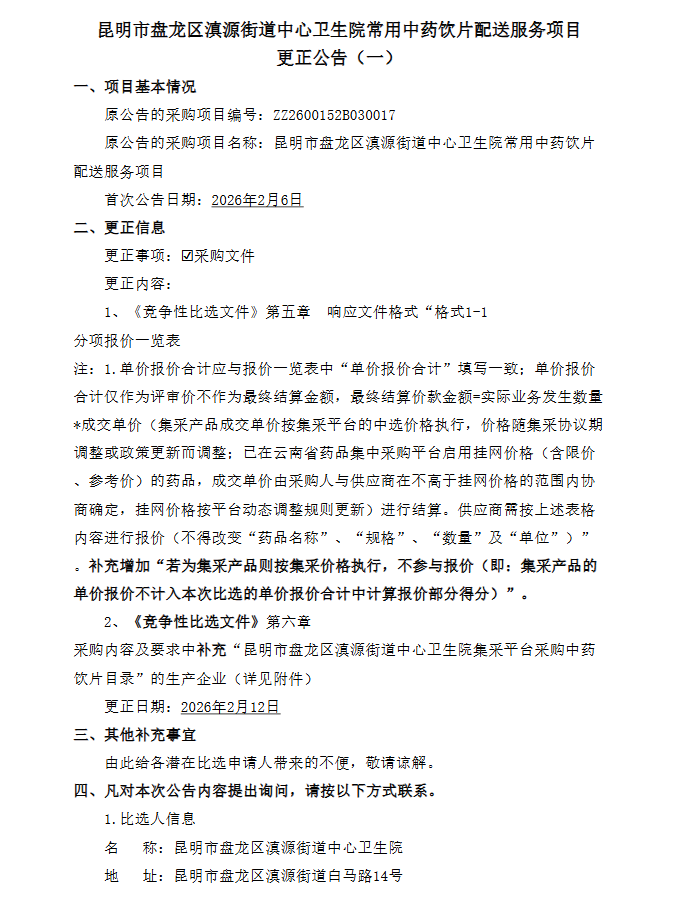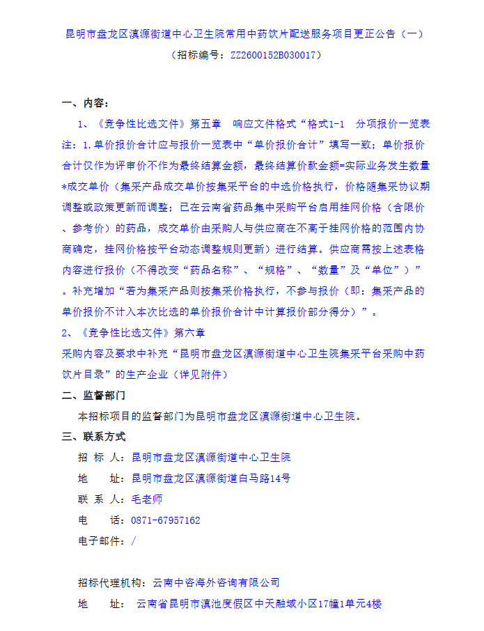 【昆明市盘龙区滇源街道中心卫生院】云南省昆明市盘龙区滇源街道中心卫生院常用中药饮片配送服务项目更正公告(一)