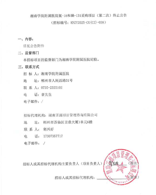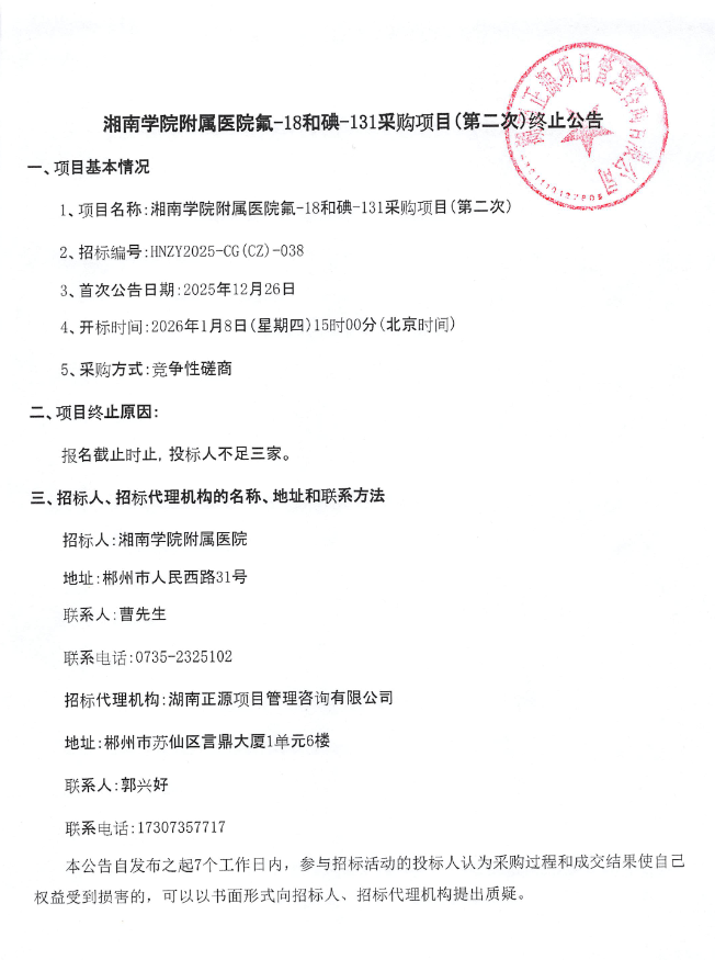 【郴州市湘南学院附属医院】湖南省湘南学院附属医院氟-18和碘-131采购项目(第二次)终止公告