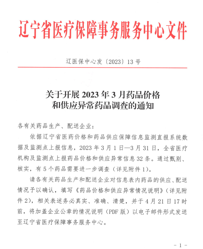 【辽宁】关于开展2023年3月份药品价格和供应异常药品调查的通知
