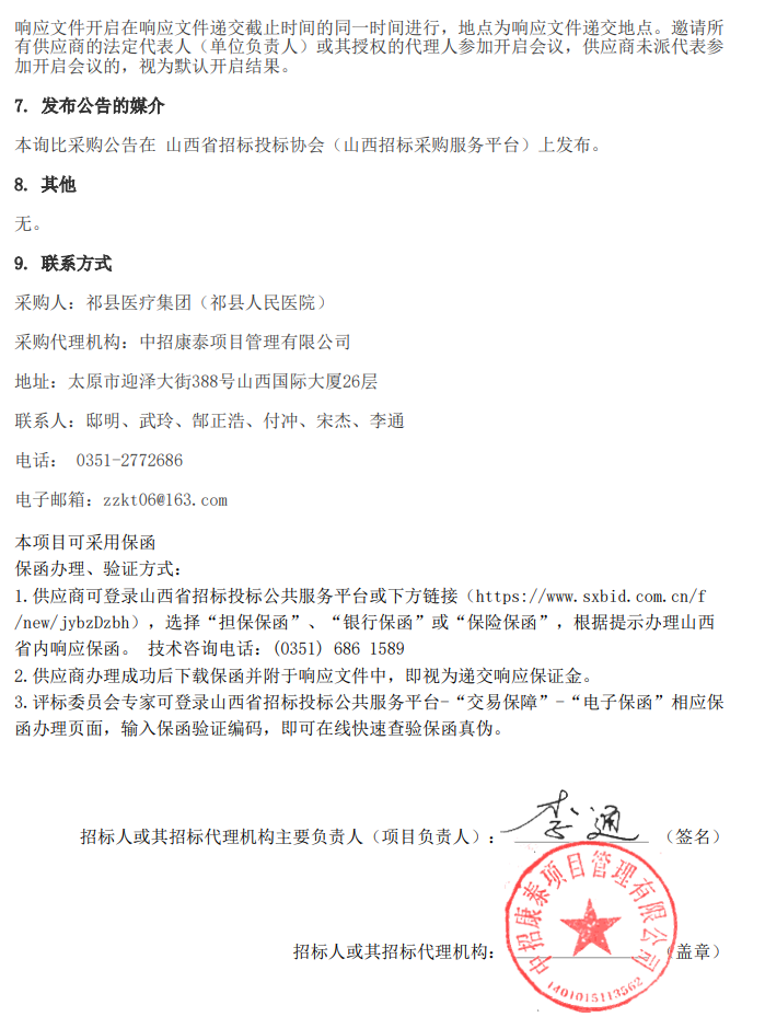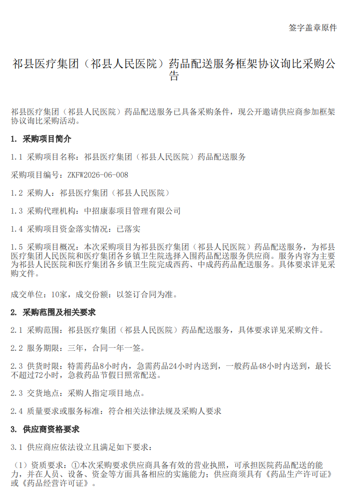 【晋中市祁县人民医院】山西省晋中市祁县医疗集团(祁县人民医院)药品配送服务框架协议询比采购公告