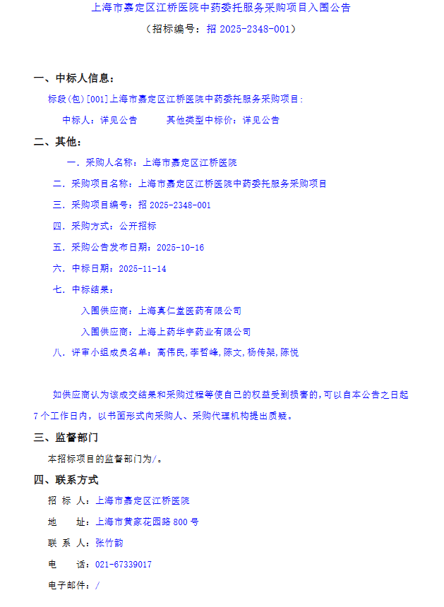 【上海市嘉定区江桥医院】上海市嘉定区江桥医院中药委托服务采购项目入围公告