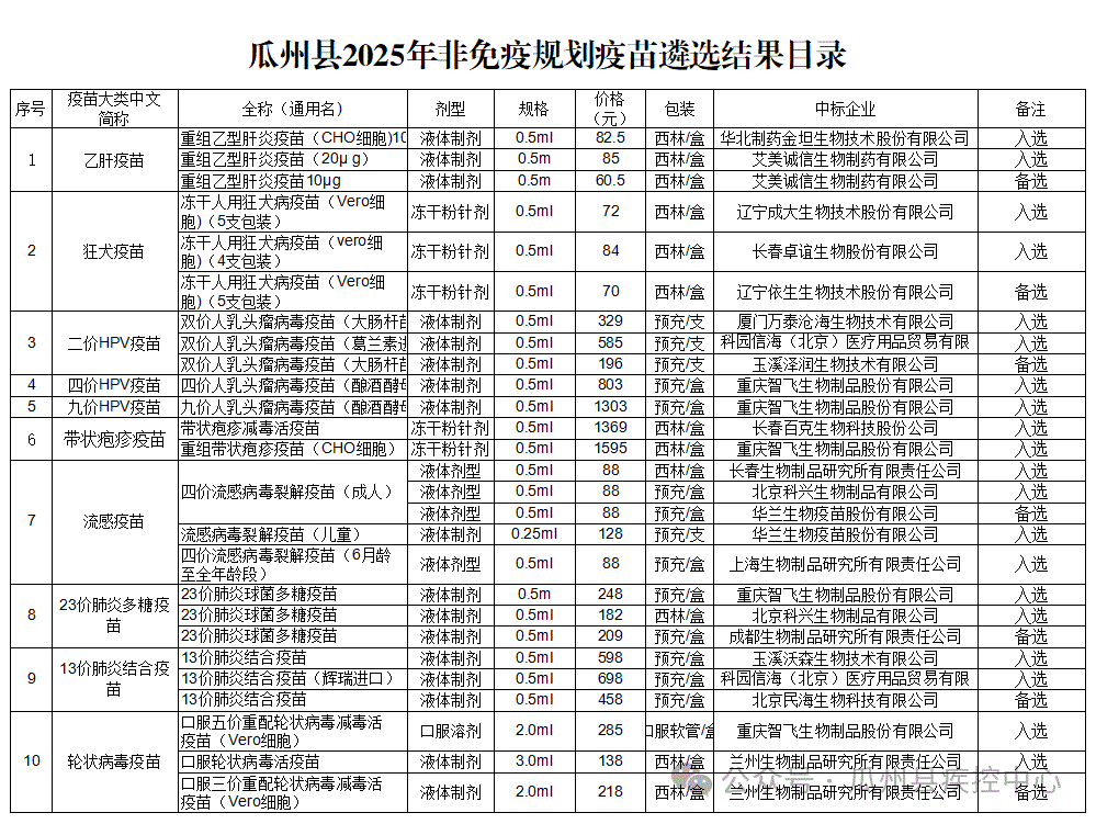 【酒泉】瓜州县2025年非免疫规划疫苗遴选结果公示