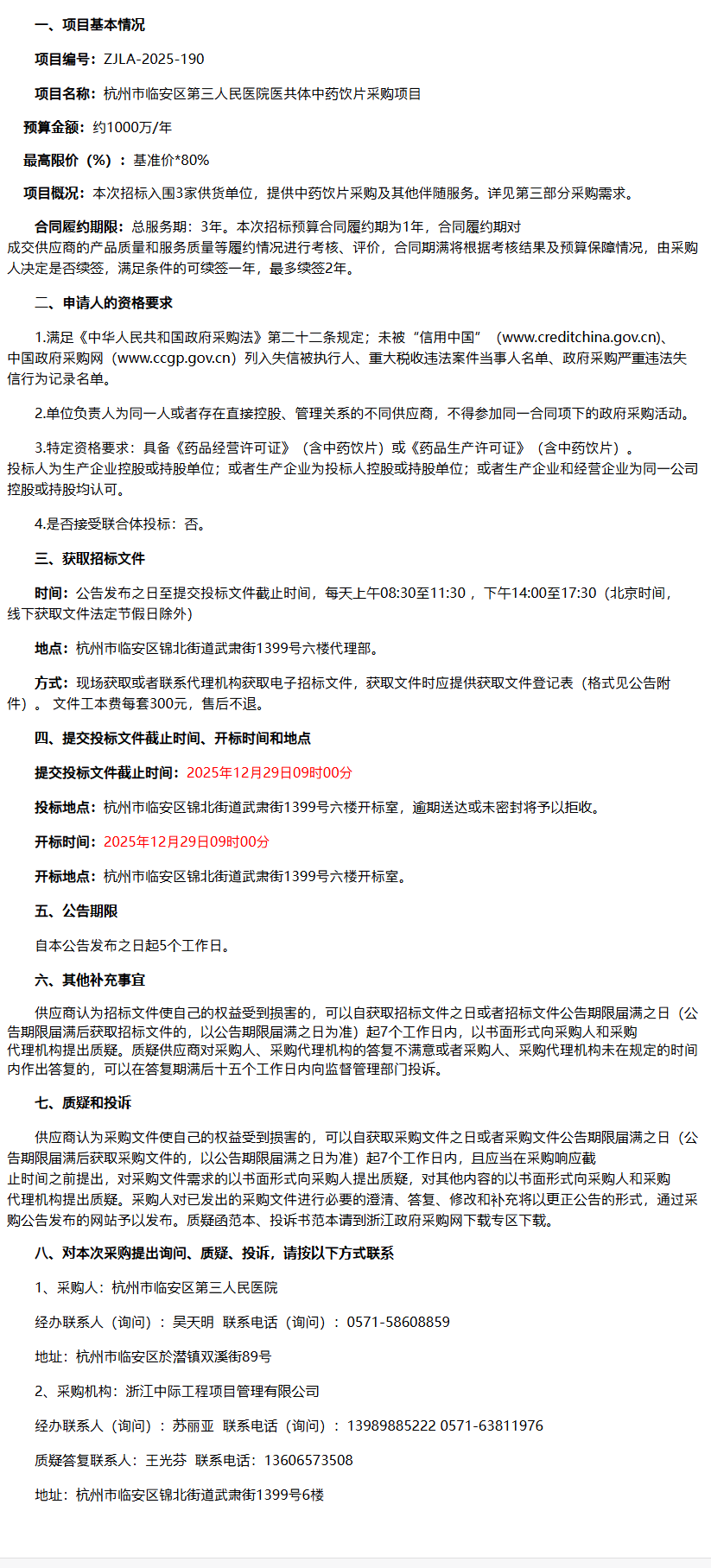 【杭州市临安区第三人民医院】浙江中际工程项目管理有限公司关于杭州市临安区第三人民医院医共体中药饮片采购项目公开招标公告(非政府采购)