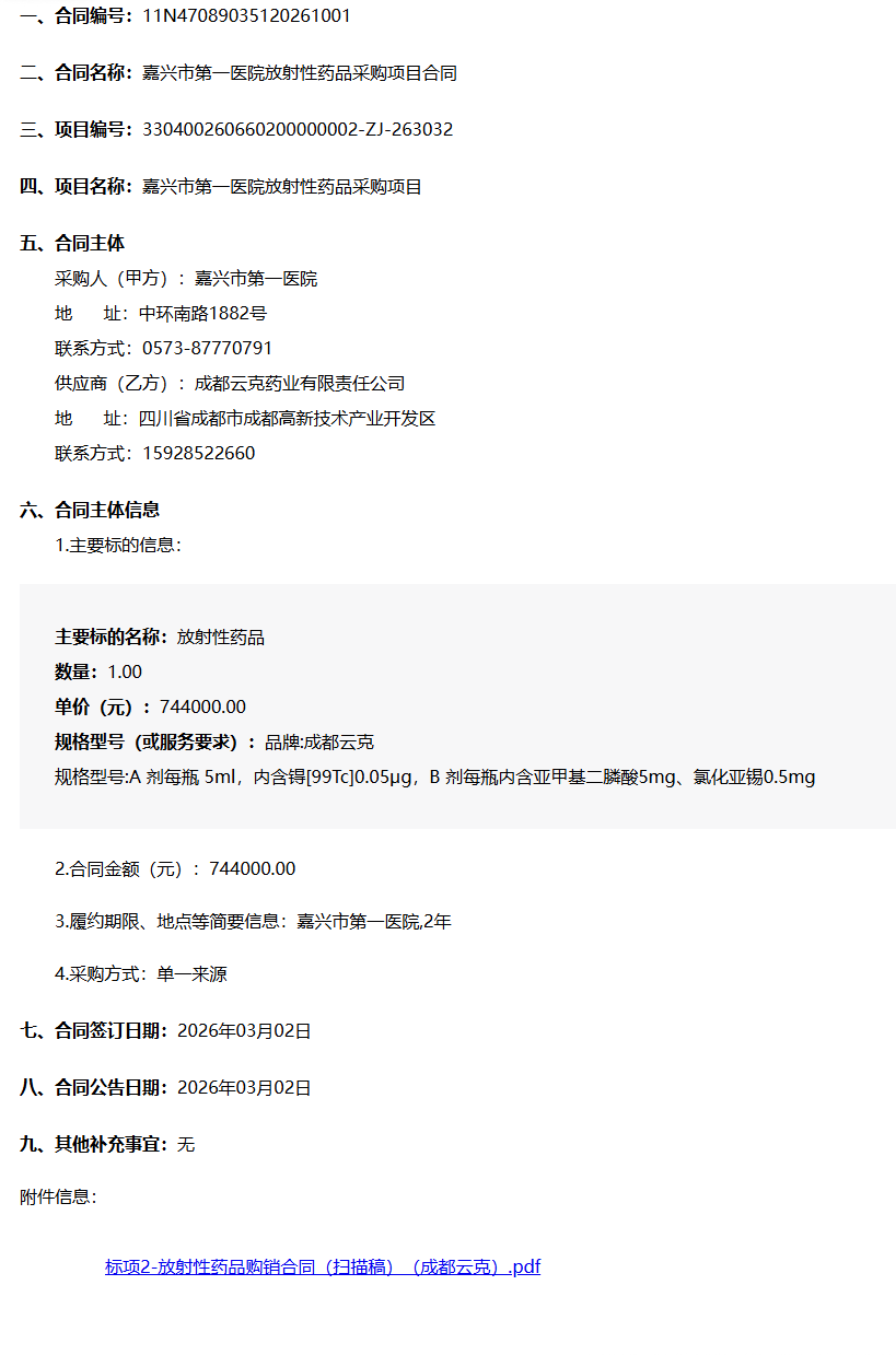 【嘉兴市第一医院】浙江省嘉兴市第一医院放射性药品采购项目合同公告