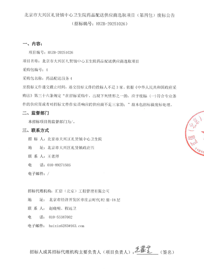 【北京市大兴区礼贤镇中心卫生院】北京市大兴区礼贤镇中心卫生院药品配送供应商选取项目(第四包)废标公告