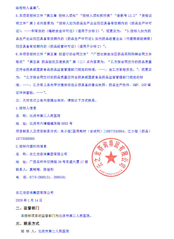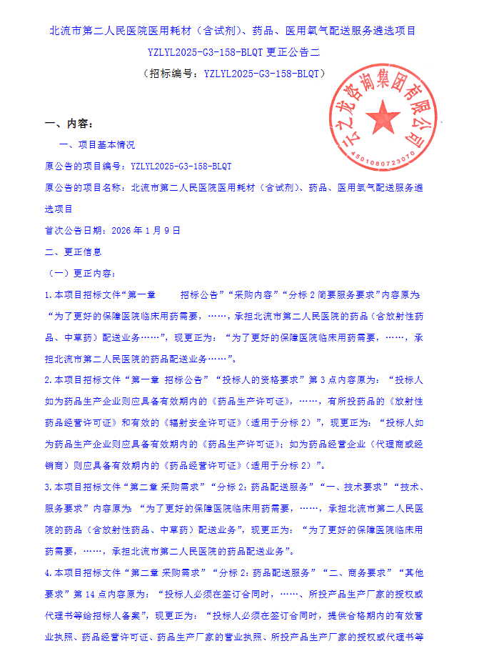 【北流市第二人民医院】广西壮族自治区北流市第二人民医院医用耗材(含试剂)、药品、医用氧气配送服务遴选项目YZLYL2025-G3-158-BLQT更正公告二