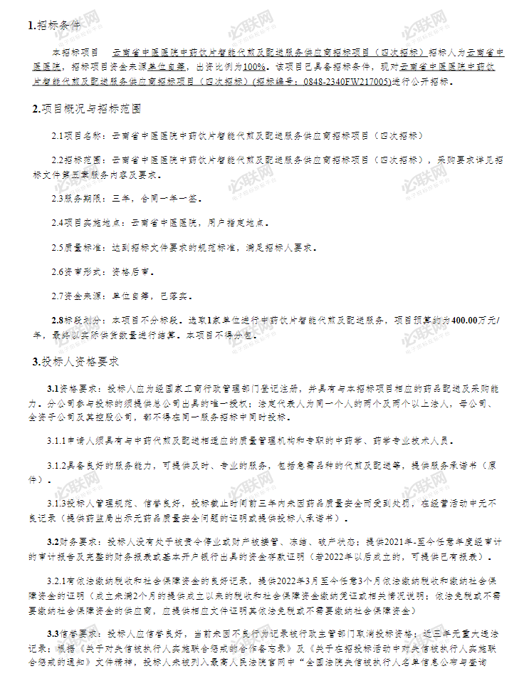 【云南省中医医院】云南省中医医院中药饮片智能代煎及配送服务供应商招标项目(四次招标)招标公告