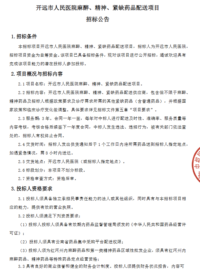 【红河哈尼族彝族自治州开远市人民医院】云南省开远市人民医院麻醉、精神、紧缺药品配送项目招标公告