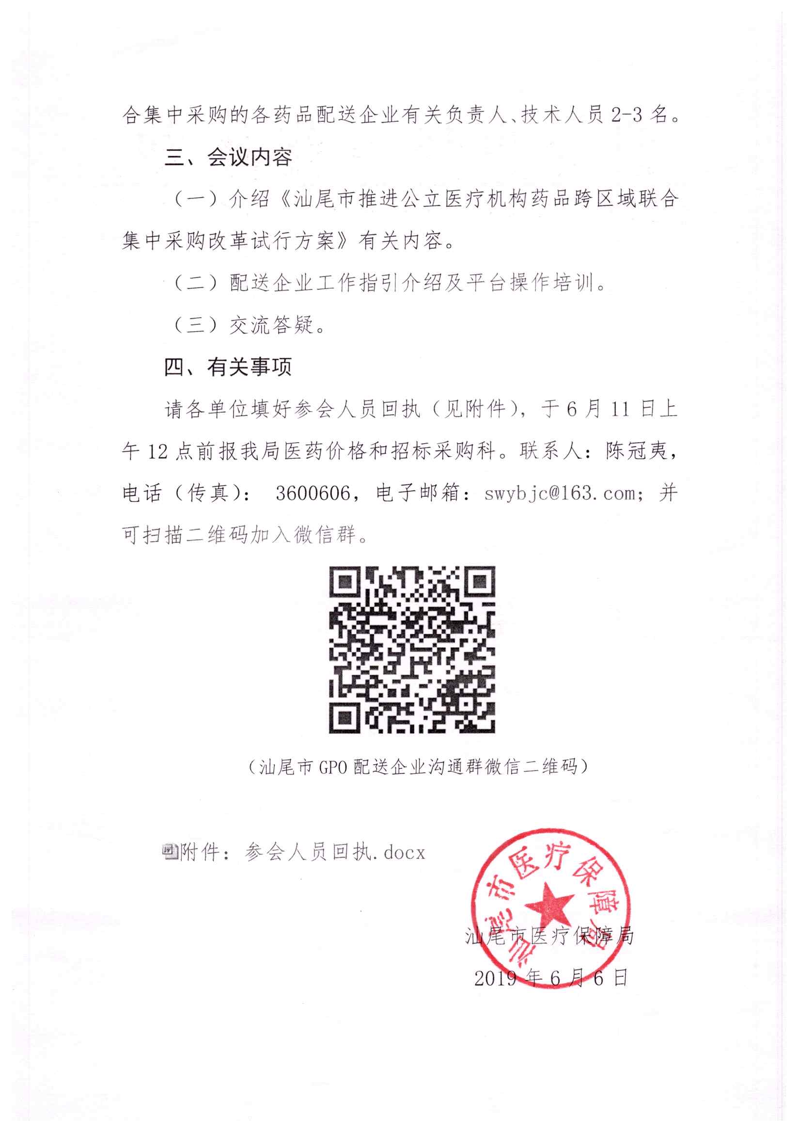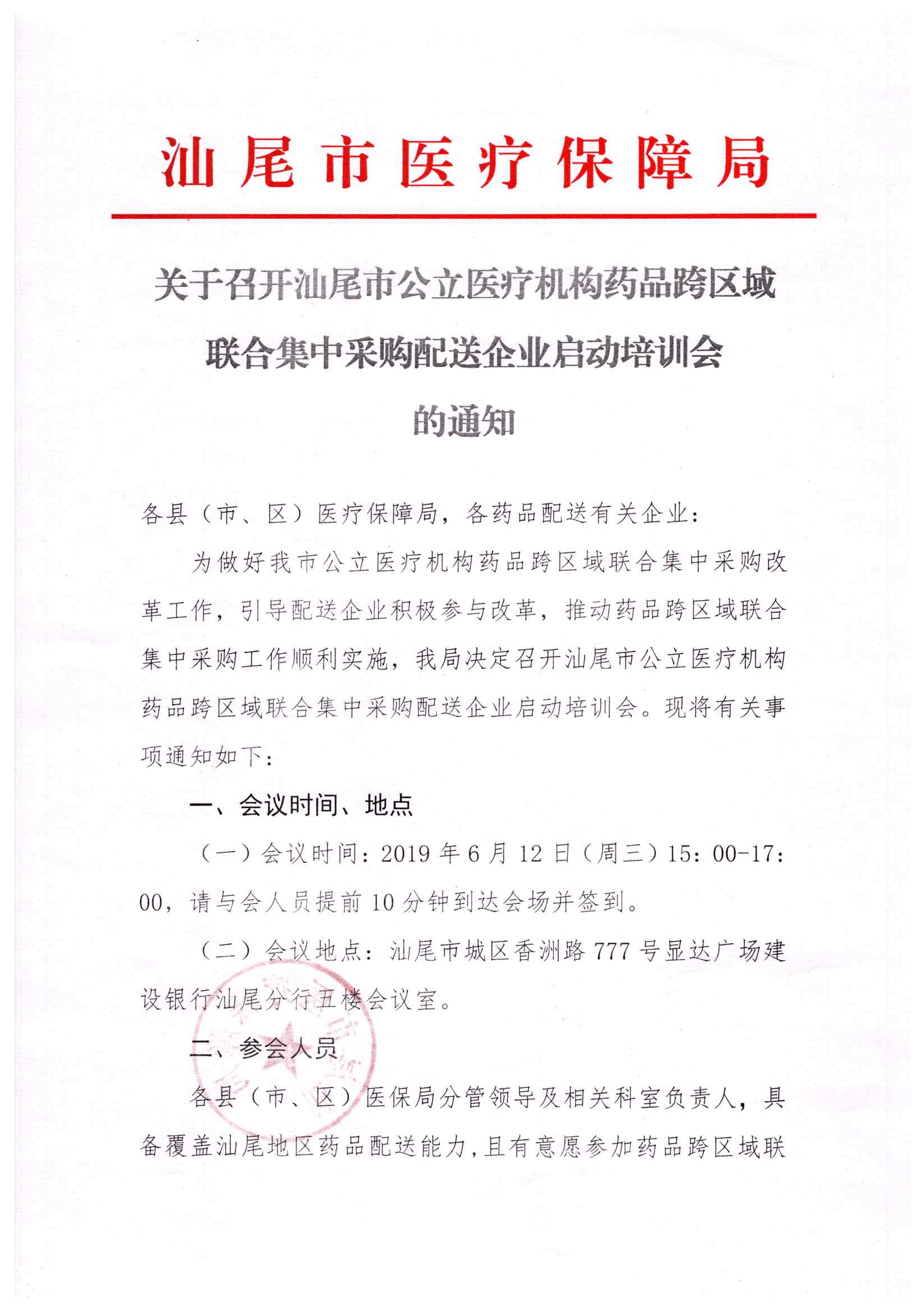 【汕尾】广东省汕尾市医疗保障局 《关于召开汕尾市公立医疗机构药品跨区域联合集中采购配送企业启动培训会的通知》