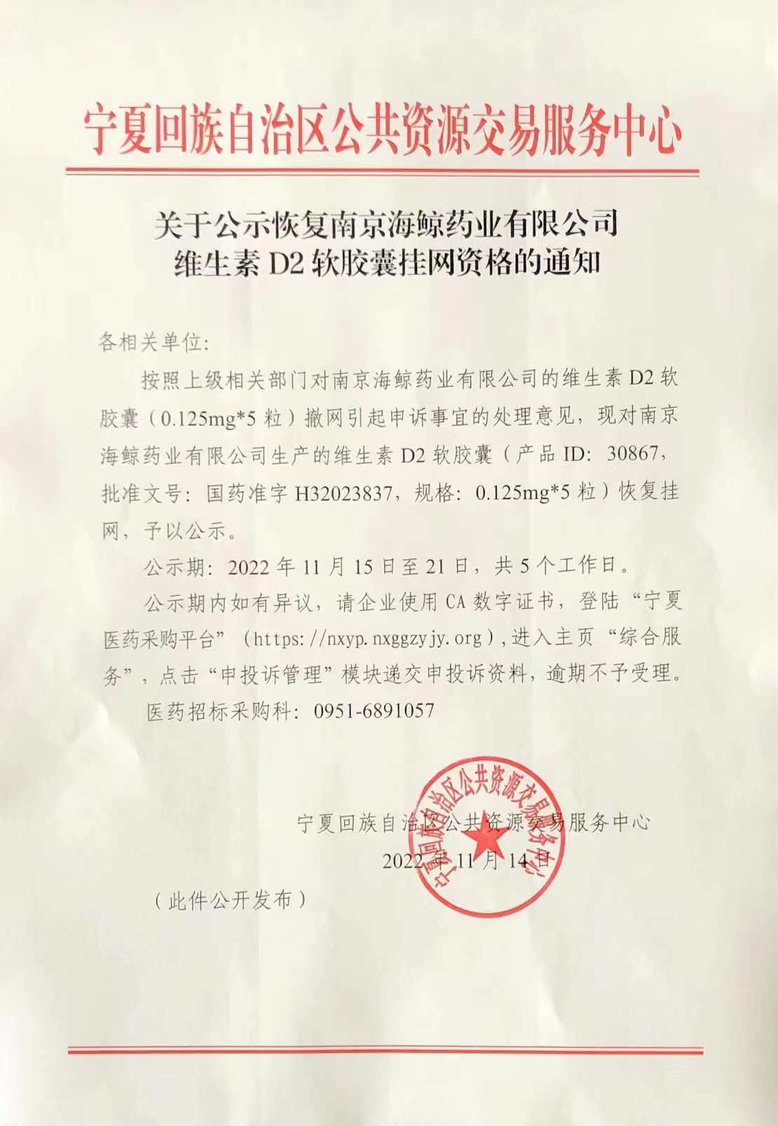 按照上级相关部门对南京海鲸药业有限公司的维生素D2软胶囊(0.125mg*5粒)撤网引起申诉事宜的处理意见,现对南京海鲸药业有限公司生产的维生素D2软胶囊(产品ID30867,批准文号国药准字H32023837,规格0.125mg*5粒)恢复挂网,予以公示。