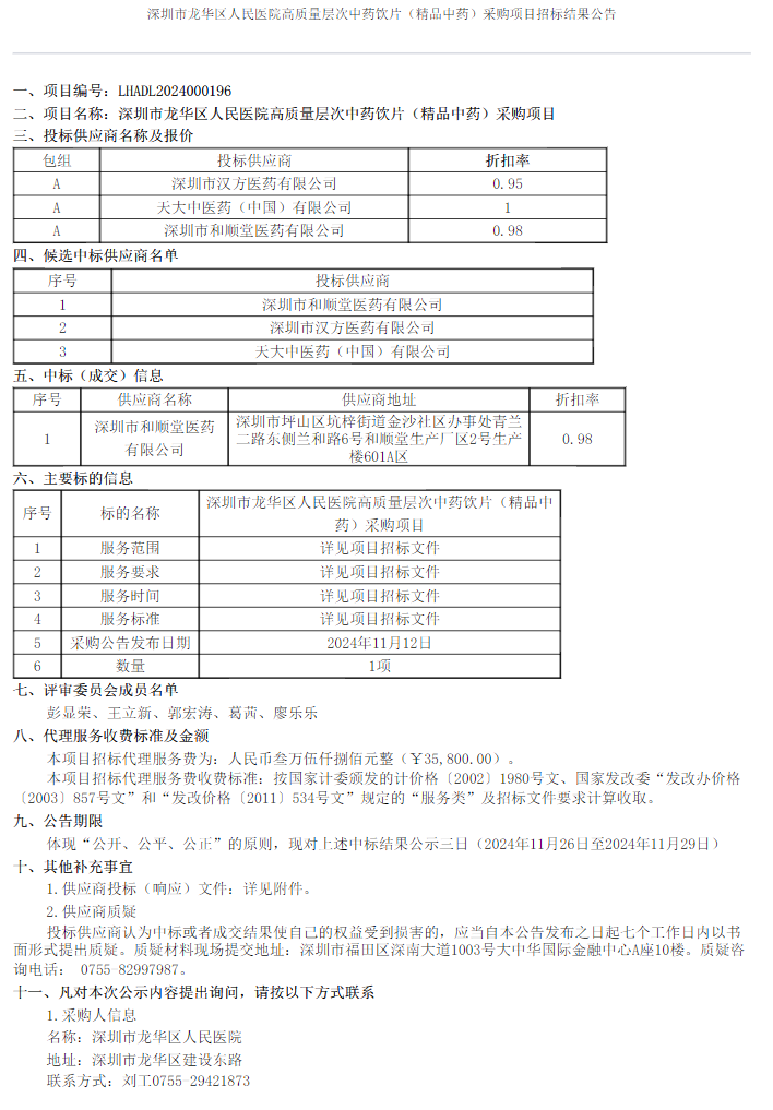 【深圳市龙华区人民医院】广东省深圳市龙华区人民医院高质量层次中药饮片(精品中药)采购项目招标结果公告