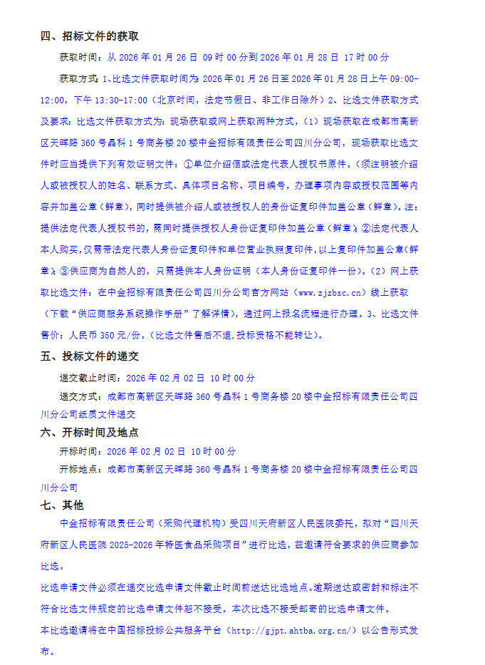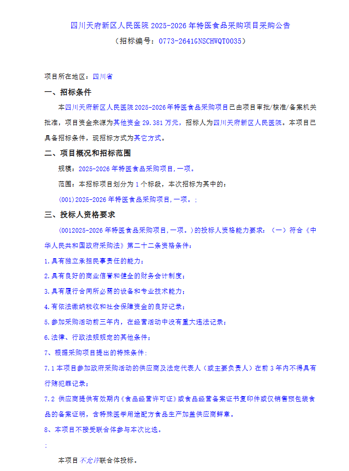 【成都市天府新区人民医院】四川天府新区人民医院2025-2026年特医食品采购项目采购公告