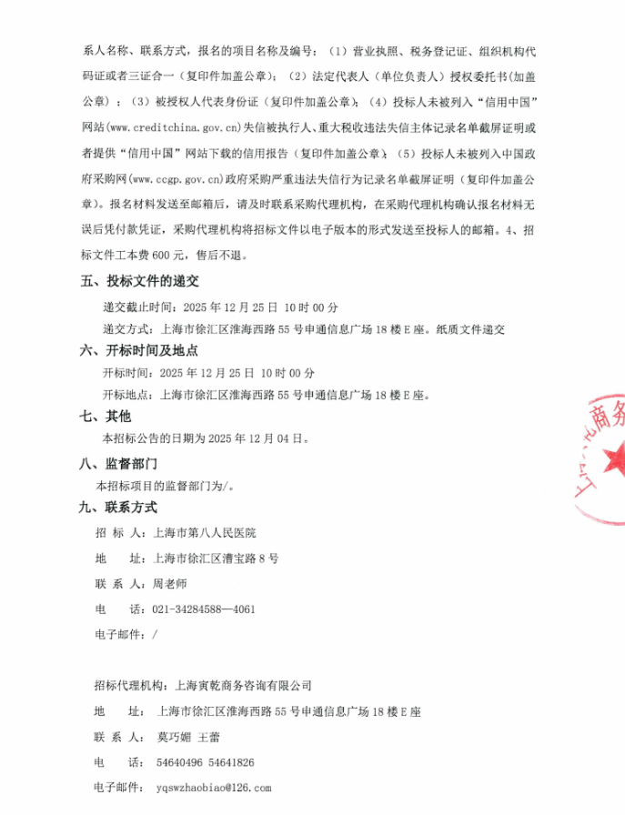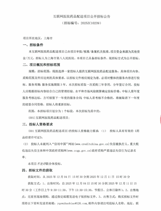 【上海市第八人民医院】上海市第八人民医院互联网医院药品配送项目公开招标公告