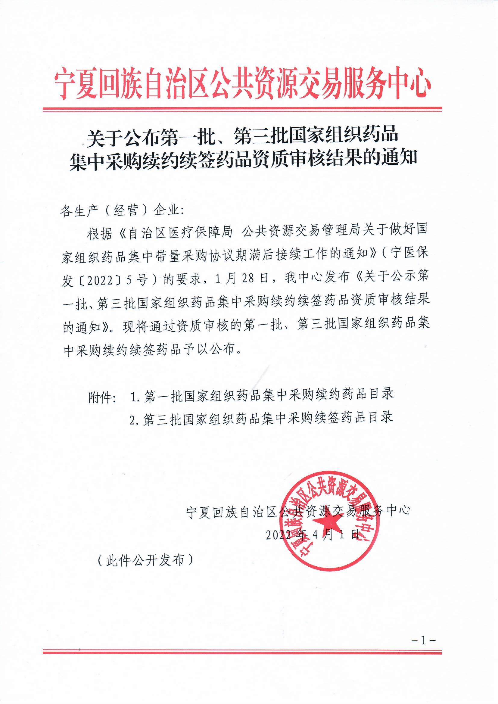 【宁夏】关于公布第一批、第三批国家组织药品集中采购续约续签药品资质审核结果的通知