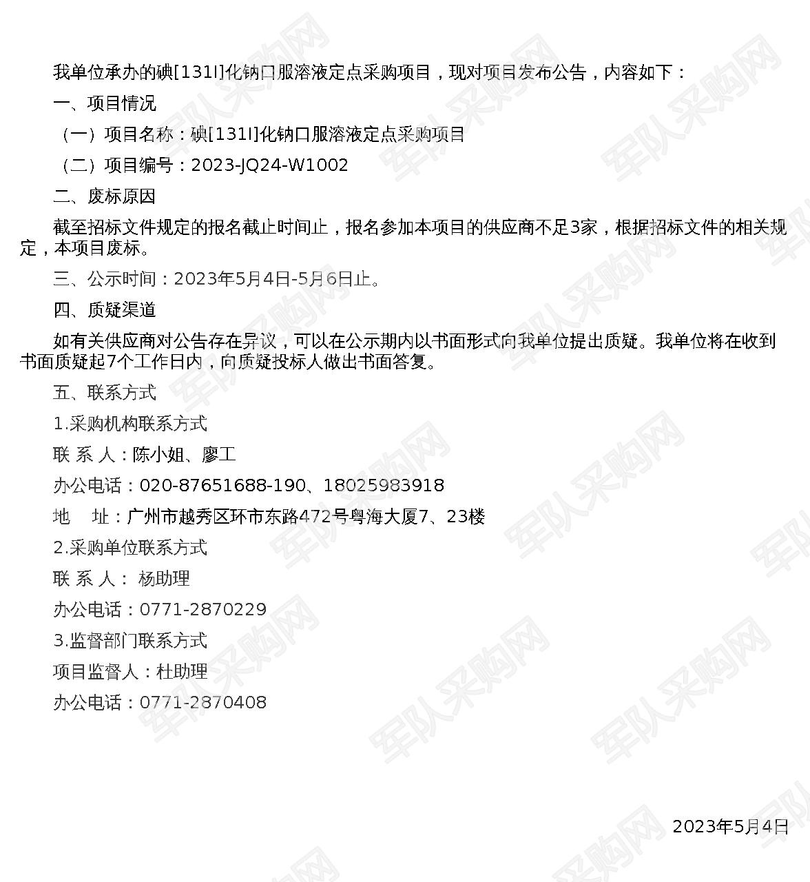 【军队采购】军队采购网南宁市某医院碘〔131I〕化钠口服溶液定点采购项目评审结果公示(项目编号:2023-JQ24-W1002)