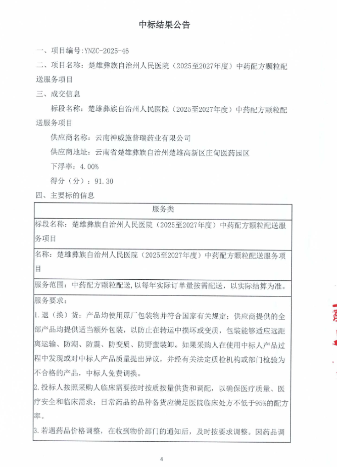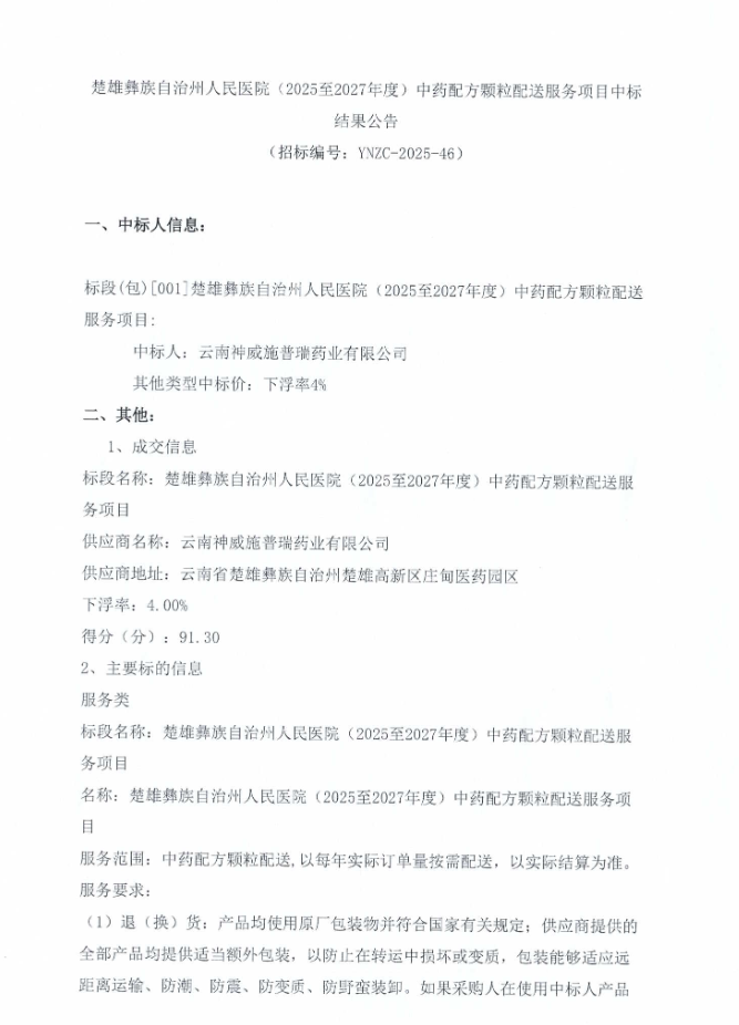 【楚雄彝族自治州人民医院】云南省楚雄彝族自治州人民医院(2025至2027年度)中药配方颗粒配送服务项目中标结果公告