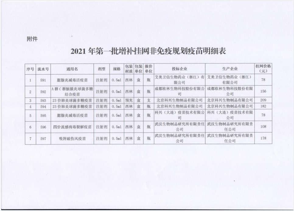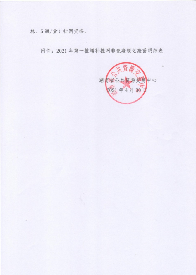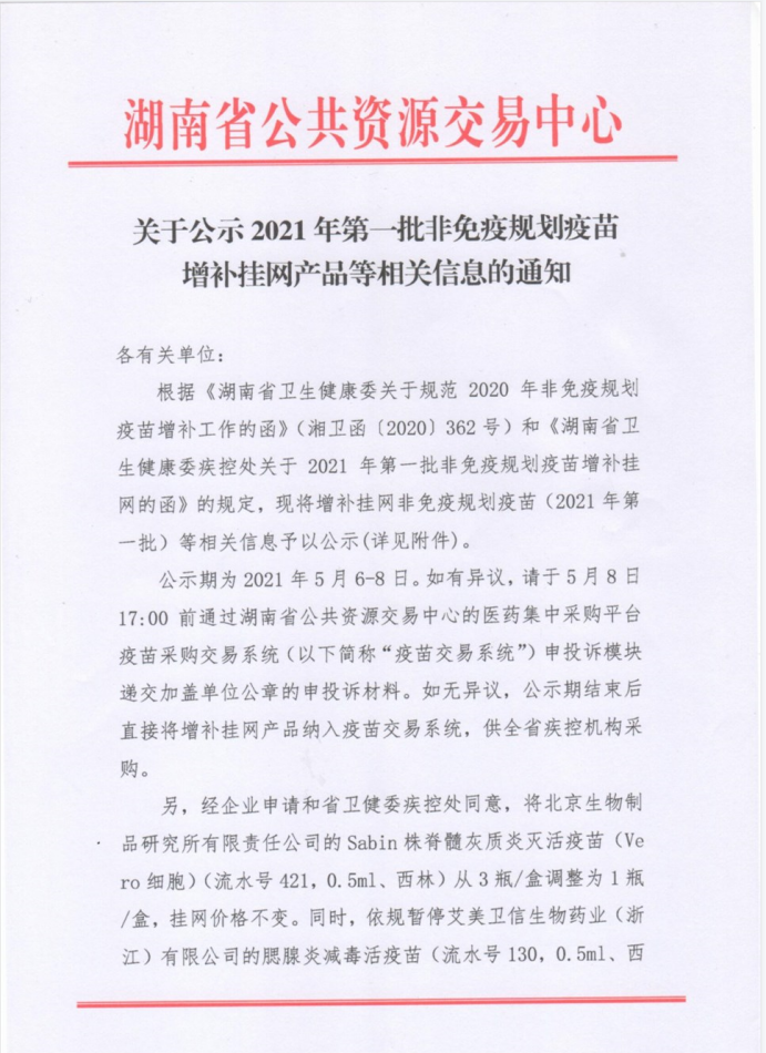 【湖南】2021年湖南省关于公示2021年第一批非免疫规划疫苗增补挂网产品等相关信息的通知