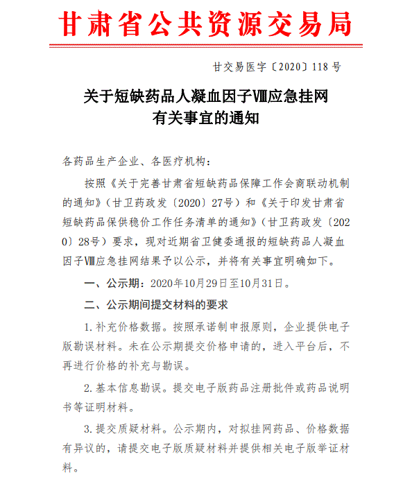 【甘肃】甘肃省关于短缺药品人凝血因子Ⅷ应急挂网有关事宜的通知