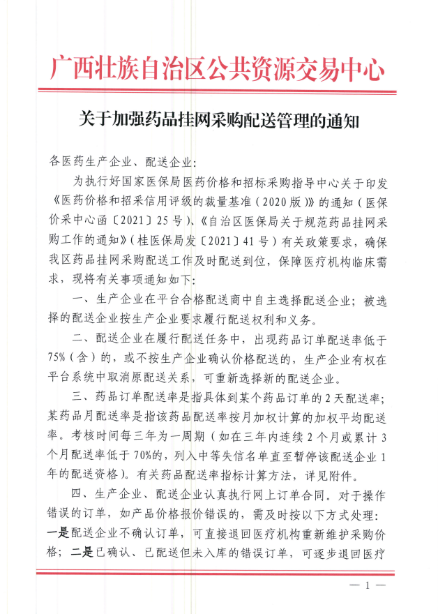 【广西】广西壮族自治区关于加强药品挂网采购配送管理的通知