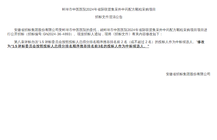 【蚌埠市中医医院】安徽省蚌埠市中医医院2024年省际联盟集采外中药配方颗粒采购项目招标文件澄清公告