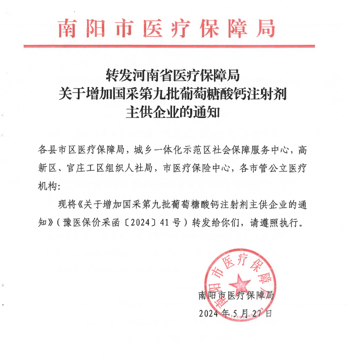 【南阳】转发河南省医疗保障局关于增加国采第九批葡萄糖酸钙注射剂主供企业的通知