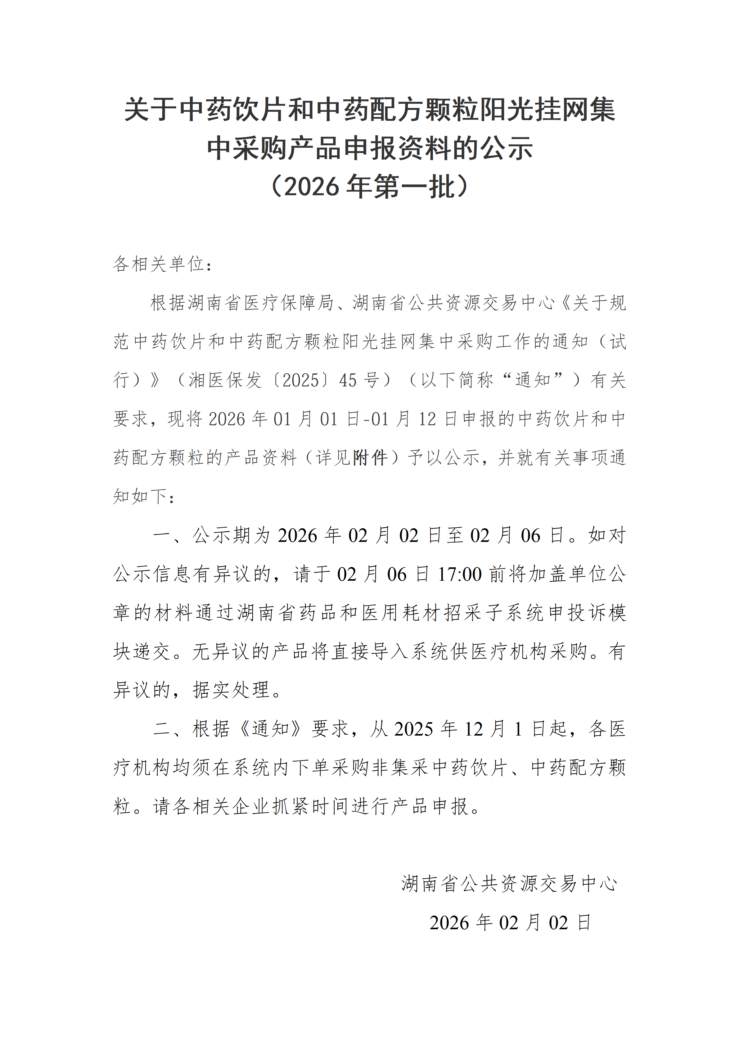 【湖南】关于中药饮片和中药配方颗粒阳光挂网集中采购产品申报资料的公示(2026年第一批)