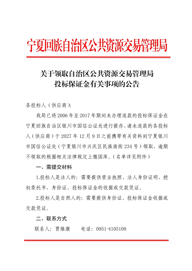 我局已将2006年至2017年期间未办理退款的投标保证金在宁夏回族自治区银川市国信公证处进行提存,请未退款的各投标人(供应商)于2027年12月9日之前携带有关资料到宁夏银川市国信公证处(宁夏银川市兴庆区民族南街234号)领取,逾期不领取的根据相关法律规定上缴国库。(名单详见附件)