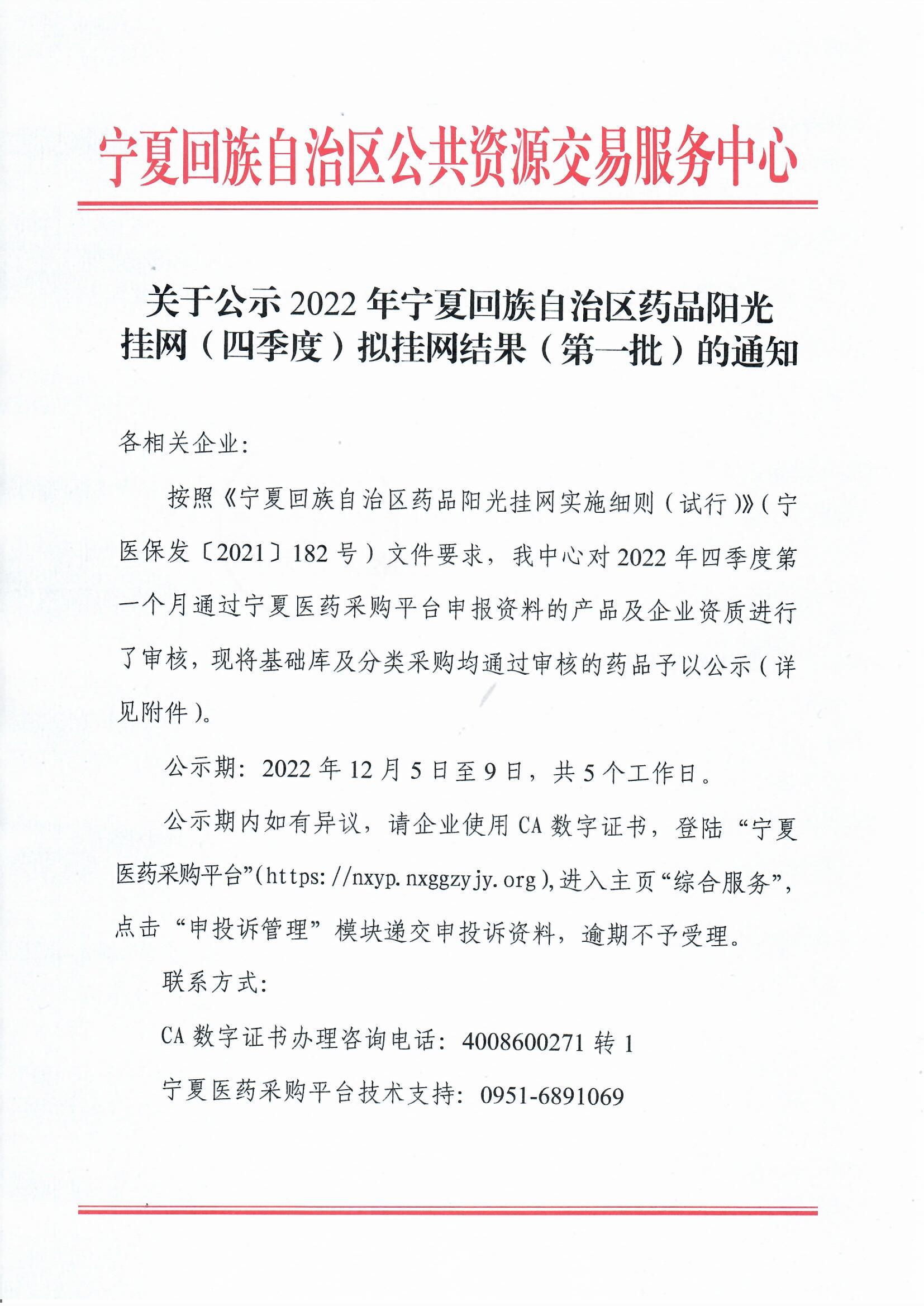 按照《宁夏回族自治区药品阳光挂网实施细则(试行)》(宁医保发〔2021〕182号)文件要求,我中心对2022年四季度第一个月通过宁夏医药采购平台申报资料的产品及企业资质进行了审核,现将基础库及分类采购均通过审核的药品予以公示(详见附件)。